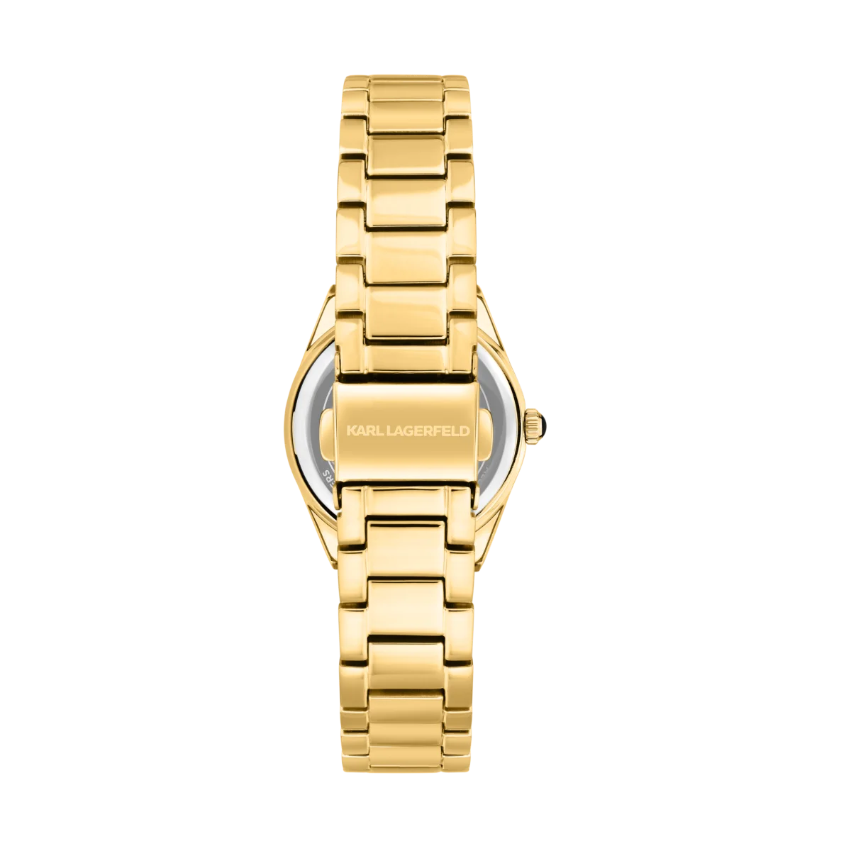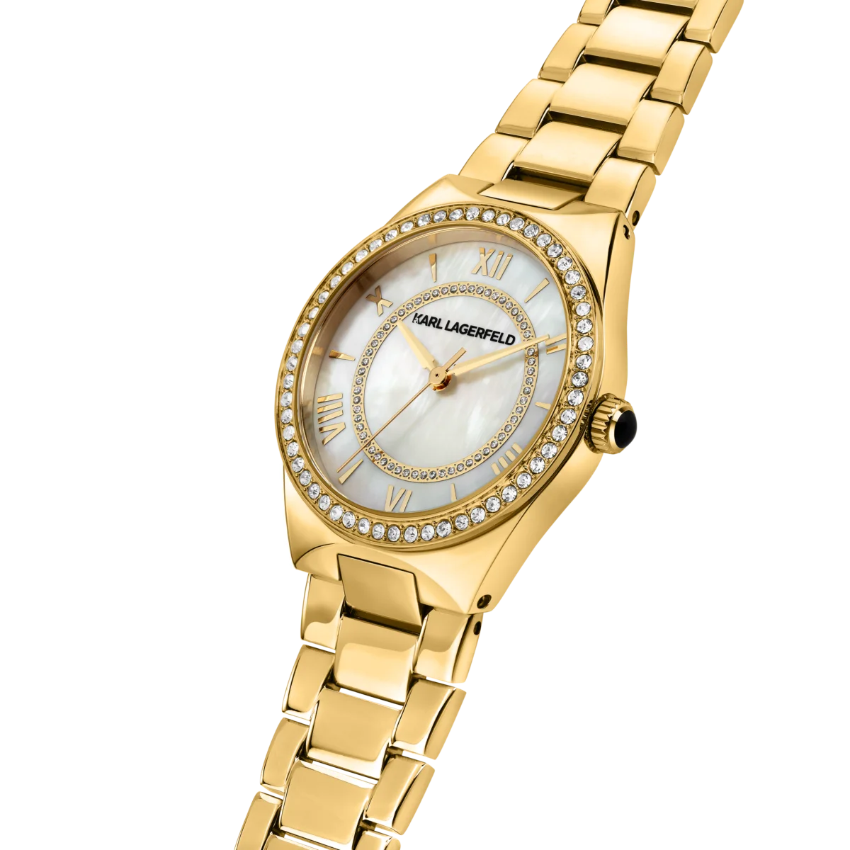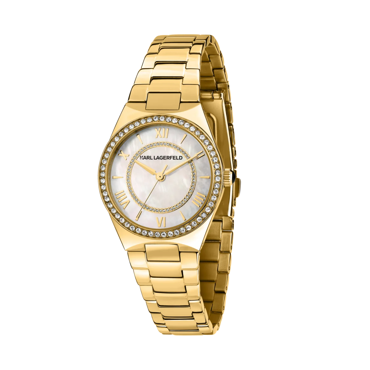 Циферблатът е изработен от естествена бяла перла (mother of pearl) с фини римски цифри и кръг от блестящи кристали в центъра. Нежните златни стрелки и логото на Karl Lagerfeld добавят модна подписност, а минералното стъкло осигурява добра защита от ежедневни надрасквания.