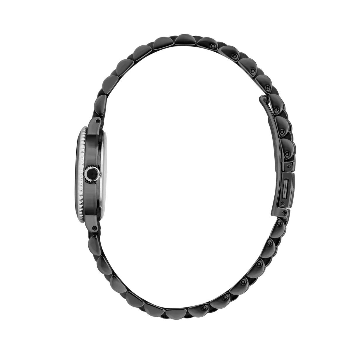 Корпусът и гривната са изработени от неръждаема стомана с PVD черно покритие, което осигурява наситен цвят и по-висока устойчивост на износване. Минералното стъкло защитава циферблата тип sunray, върху който трите контрастни стрелки изпъкват ясно. Обемните звена на гривната придават усещане за елегантна стоманена гривна, а разгъващата се закопчалка с бутони държи часовника стабилно на китката.