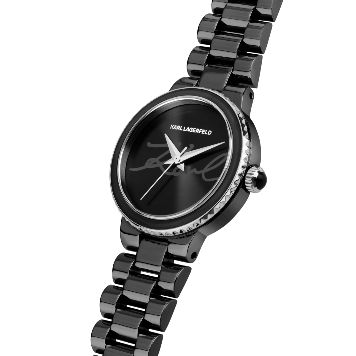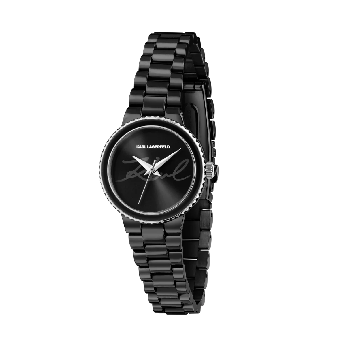 Дамският часовник KARL LAGERFELD Kaiser е създаден за почитателките на дръзкия минимализъм в черно. Компактният кръгъл корпус с диаметър 28 мм и релефният безел образуват изчистен силует, а черният циферблат с дискретен надпис „Karl“ придава характер на всяка визия.