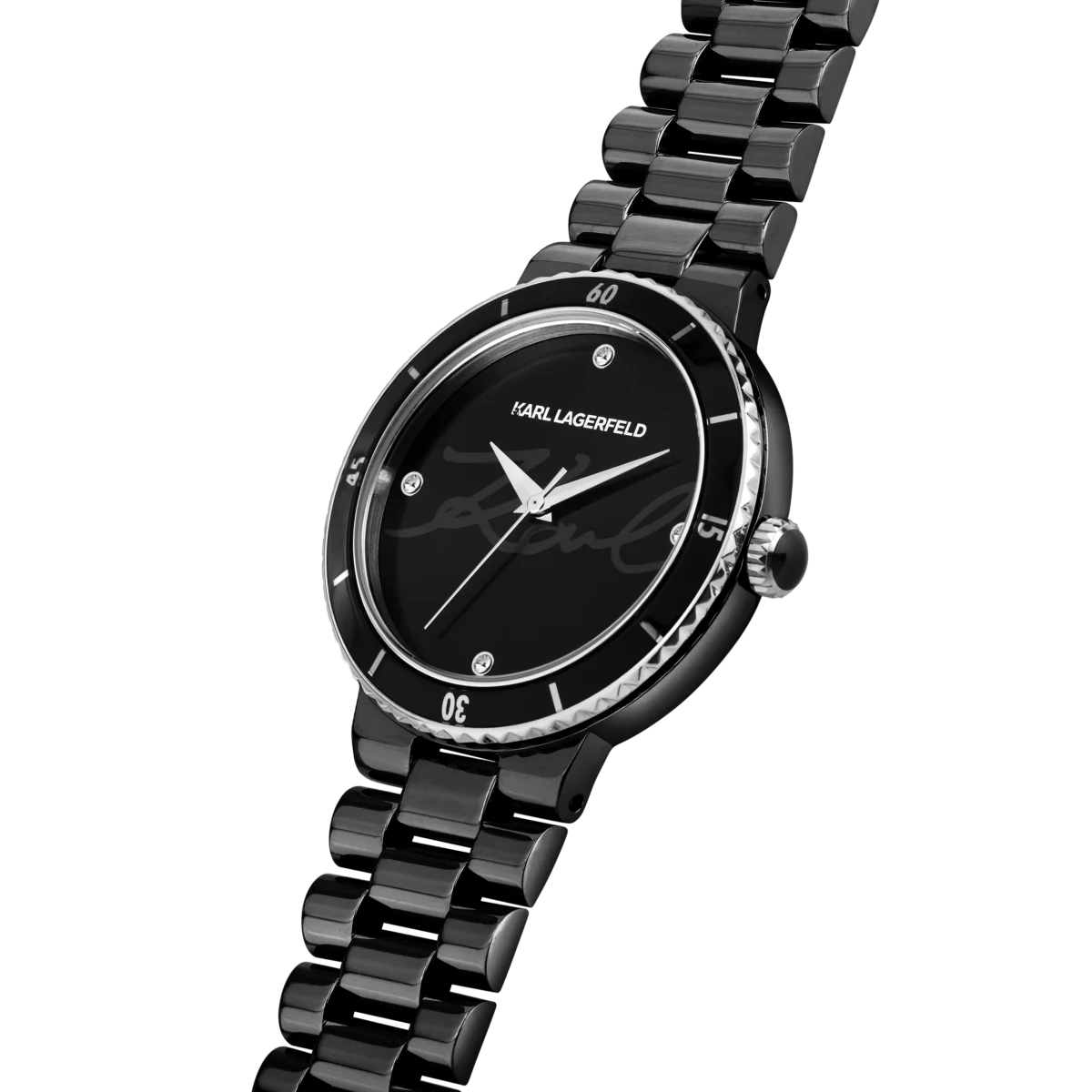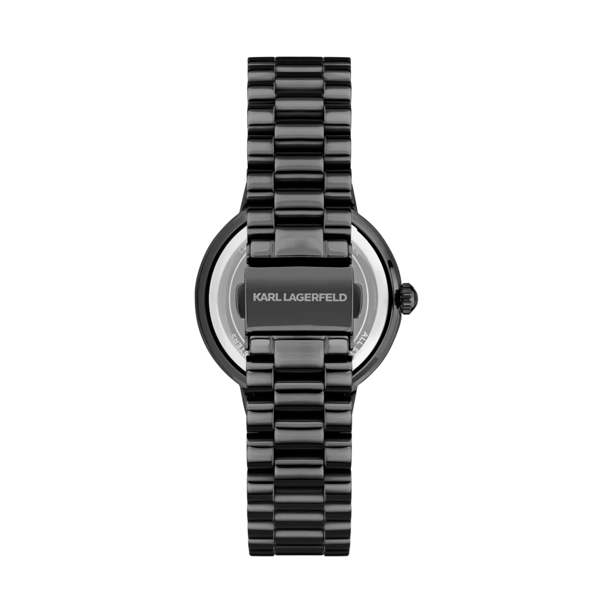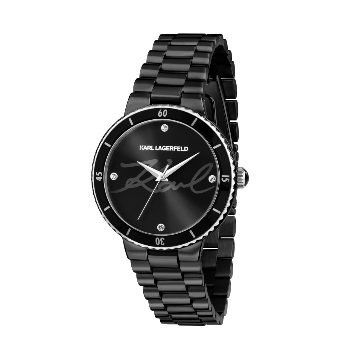 Дамски часовник Karl Lagerfeld Kaiser е създаден за жени, които обичат дръзкия, изцяло черен стил. Кръглият корпус с диаметър 36 мм и изчистеният черен безел оформят силует, който се откроява както до делови костюм, така и до малка черна рокля. Лаконичният черен циферблат е украсен с фини кристали и подписа на Karl – емблематичен детайл за марката.