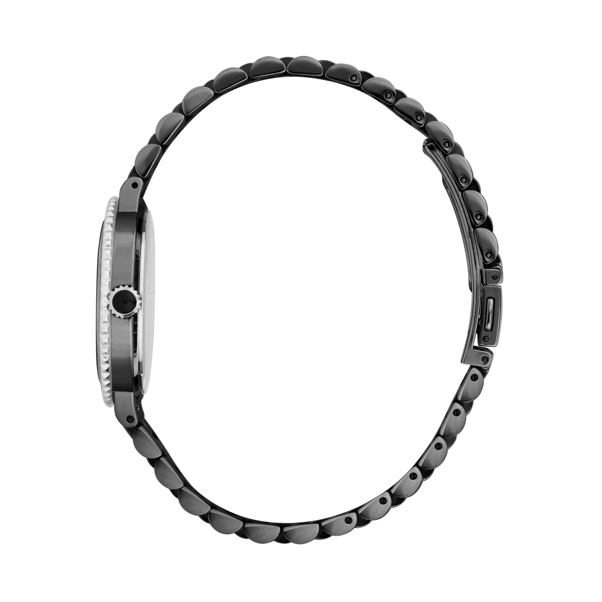 Корпусът и верижката са изработени от неръждаема стомана с черно IP покритие, което придава наситен цвят и допълнителна устойчивост на износване. Минералното стъкло защитава циферблата от дребни надрасквания, а стоманената верижка с разгъваща се закопчалка стои стабилно и удобно на китката. Това е елегантен дамски часовник, който носи усещане за моден аксесуар от подиума.