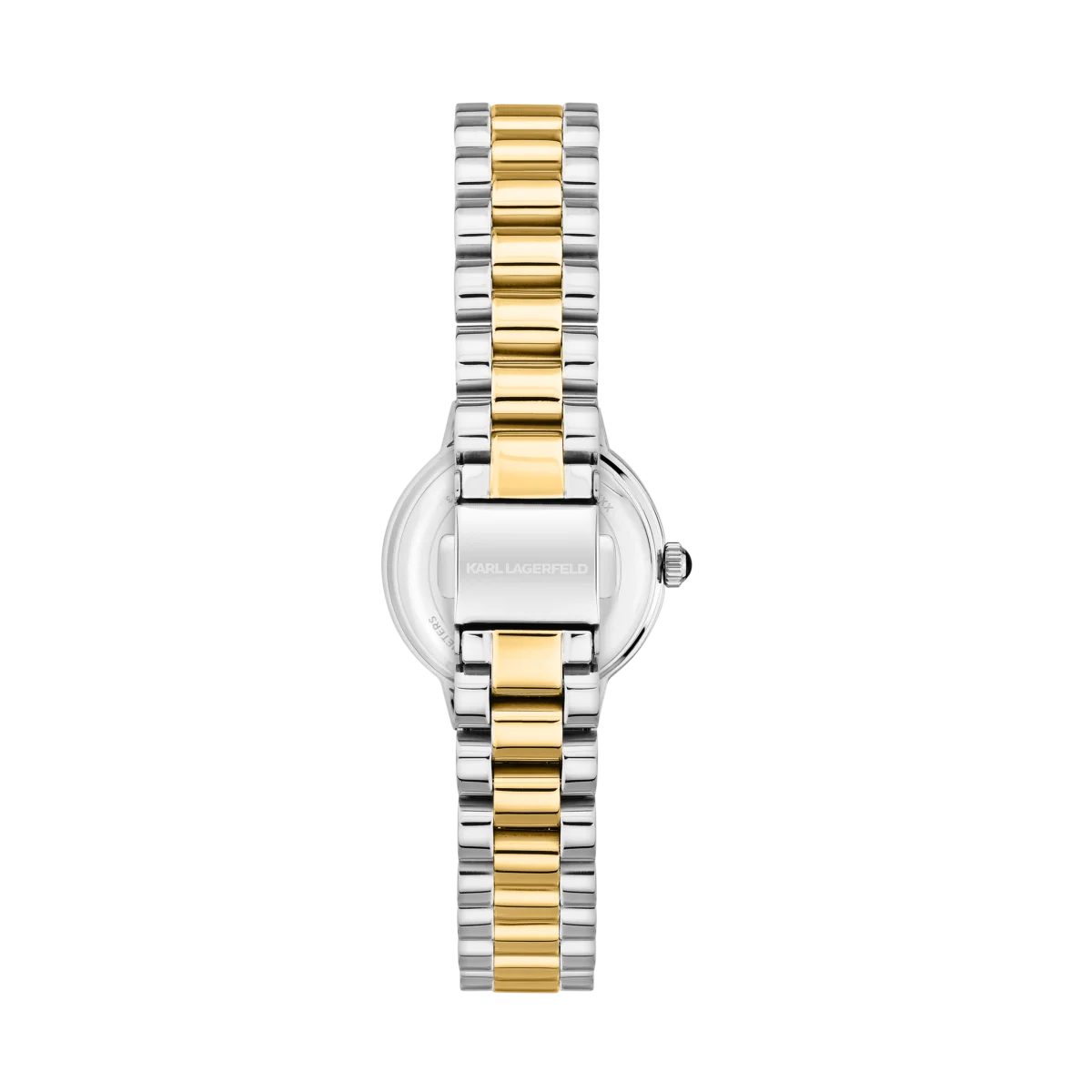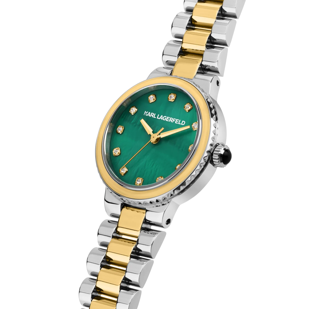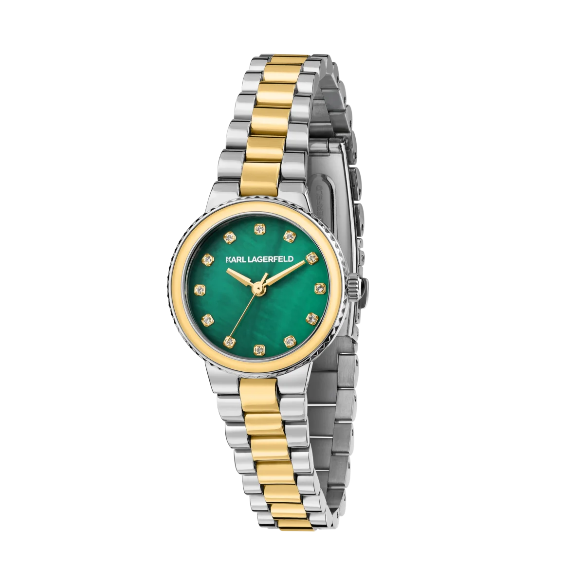 Дамският часовник KARL LAGERFELD Kaiser впечатлява с изискано двуцветно излъчване и дълбок зелен седефен циферблат. Компактният корпус 28 мм и деликатният вълнообразен безел оформят женствен силует, а златистите индекси с кристали добавят бижутерийна нотка към всяка визия.