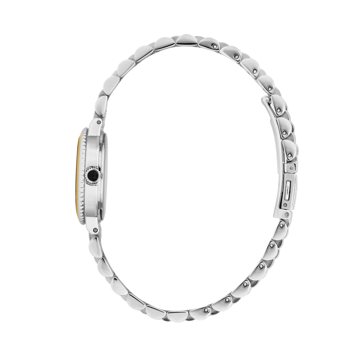 Корпусът и гривната са изработени от неръждаема стомана с IP златисто покритие по безела и централните звена, което осигурява наситен цвят и по-добра устойчивост на износване. Минералното стъкло предпазва зеления седефен циферблат, върху който три златисти стрелки ясно показват часа, минутите и секундите. Двуцветната стоманена верижка тип bracelet завършва усещането за луксозно бижу на китката.