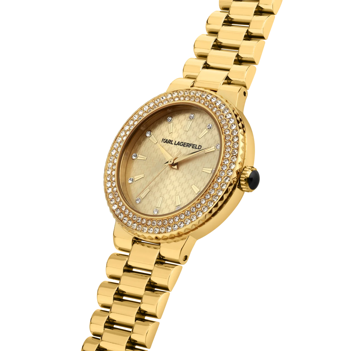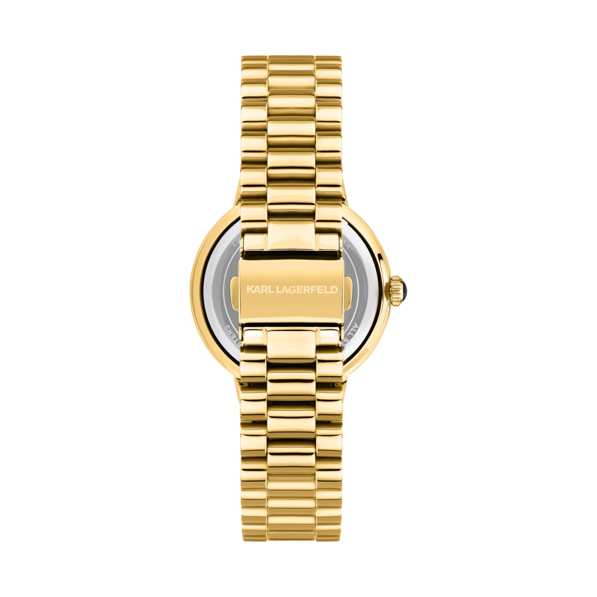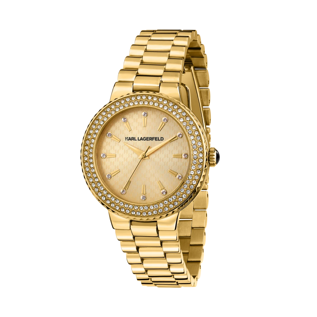 Дамският часовник Karl Lagerfeld Kaiser е създаден като ярък моден акцент, който изглежда като луксозна гривна на китката. Кръглият корпус е обграден от две редици блестящи кристали, а златистият циферблат създава ефект на слънчеви лъчи и веднага привлича погледите.