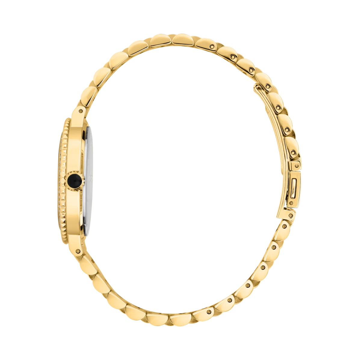 Корпусът и верижката са изработени от неръждаема стомана с IP златно покритие, което осигурява по-висока устойчивост на цвета и изтъркването в сравнение с обикновена позлата. Минералното стъкло надеждно защитава циферблата от дребни надрасквания. Индексите са оформени като златисти маркери с инкрустирани кристали, а трите стрелки в златист цвят подчертават лесната четимост на часа.