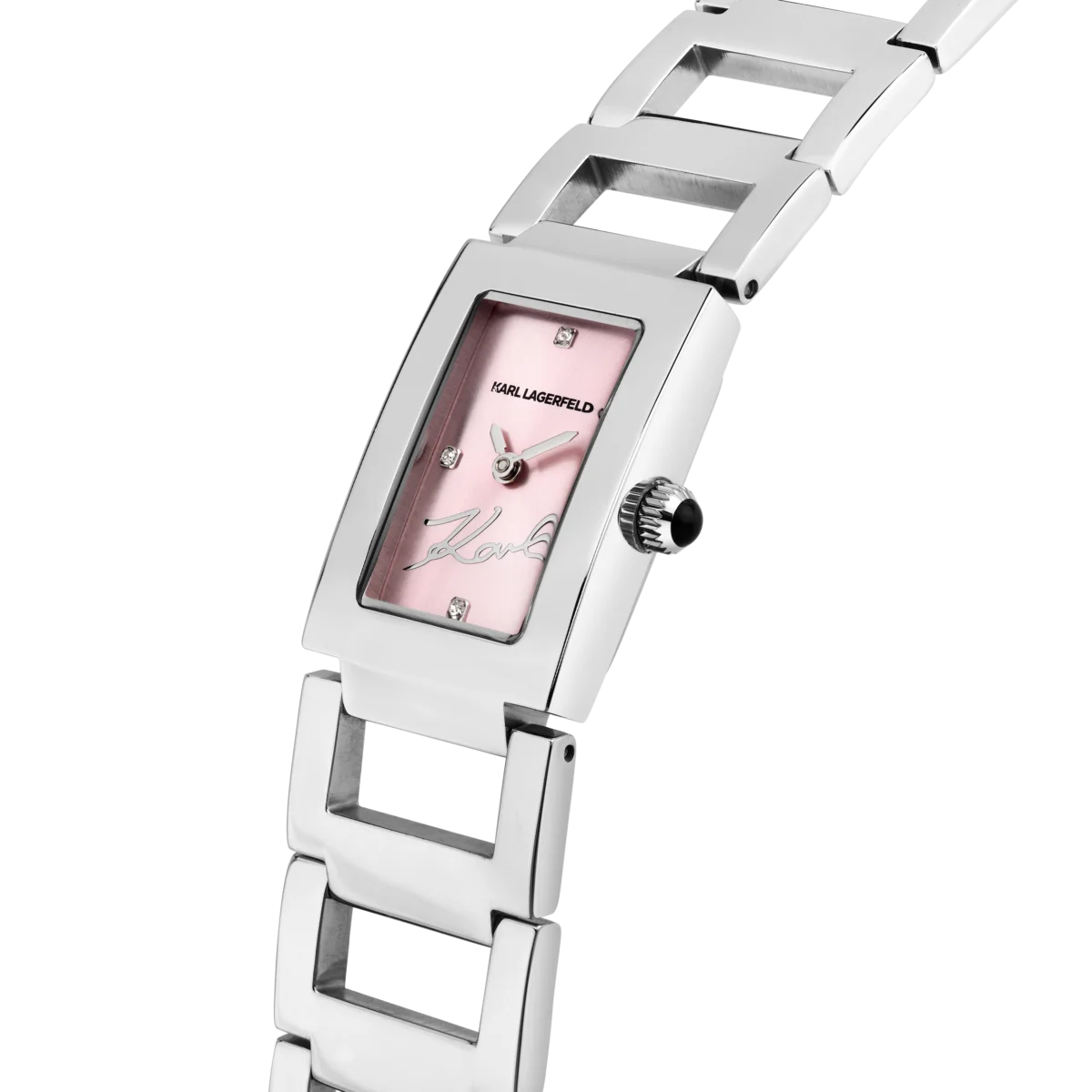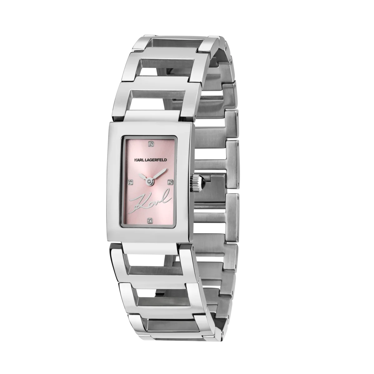 Елегантен дамски часовник Karl Lagerfeld Paris, създаден като изискано бижу за китката. Правоъгълният корпус с размер 21 × 36 мм и полираното сребристо покритие подчертават модерната геометрична верижка, която стои като гривна. Нежният розов циферблат тип sunray е акцентиран от четири блестящи кристала и стилизирания подпис Karl – фин детайл, който носи духа на haute couture.