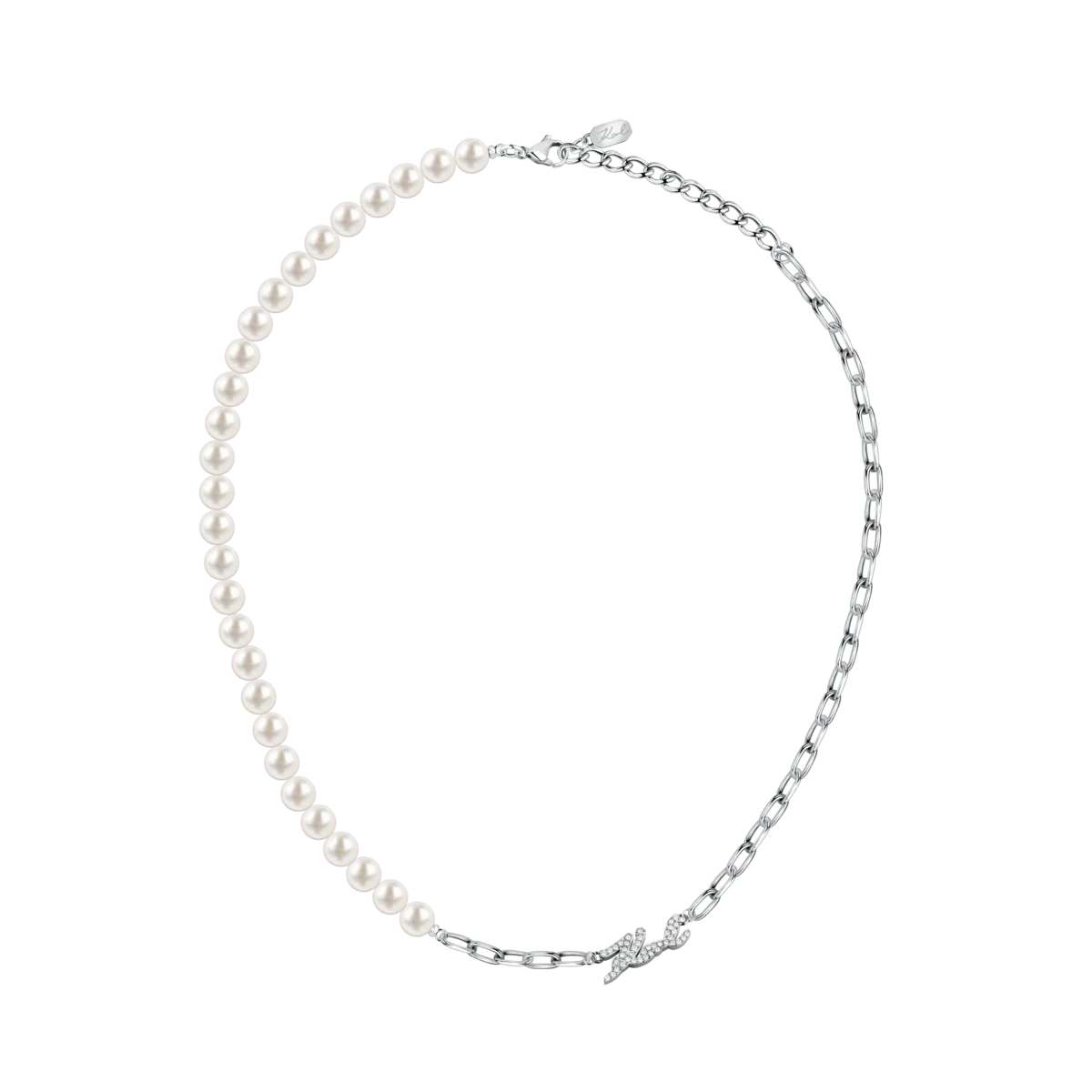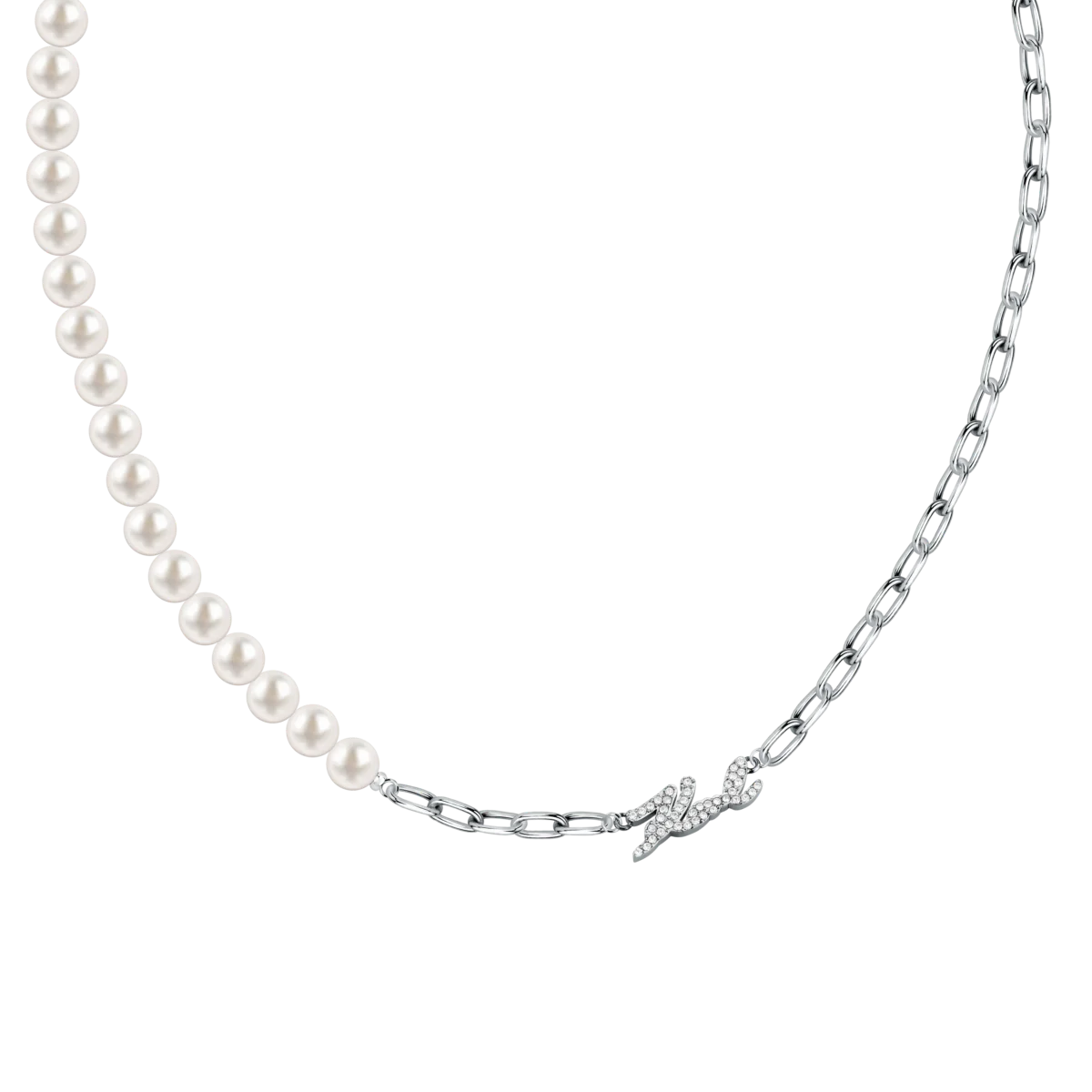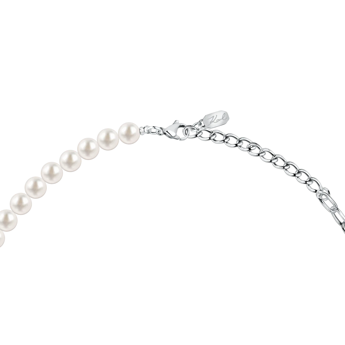 Дамското колие Karl Lagerfeld Pearl KLAYR03 е смело и модерно тълкуване на класическата перлена огърлица. Едната половина е наниз от нежни бели перли, а другата – фина сребриста стоманена верижка, завършени отпред с искрящ емблематичен елемент във формата на инициала „K“.