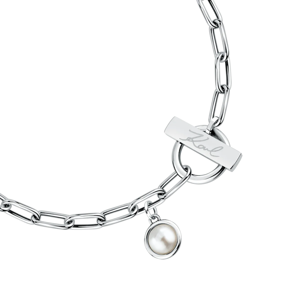 Дамска гривна Karl Lagerfeld Pearl от неръждаема стомана с висяща бяла shell перла – модел KLAYR06, изглед отпред