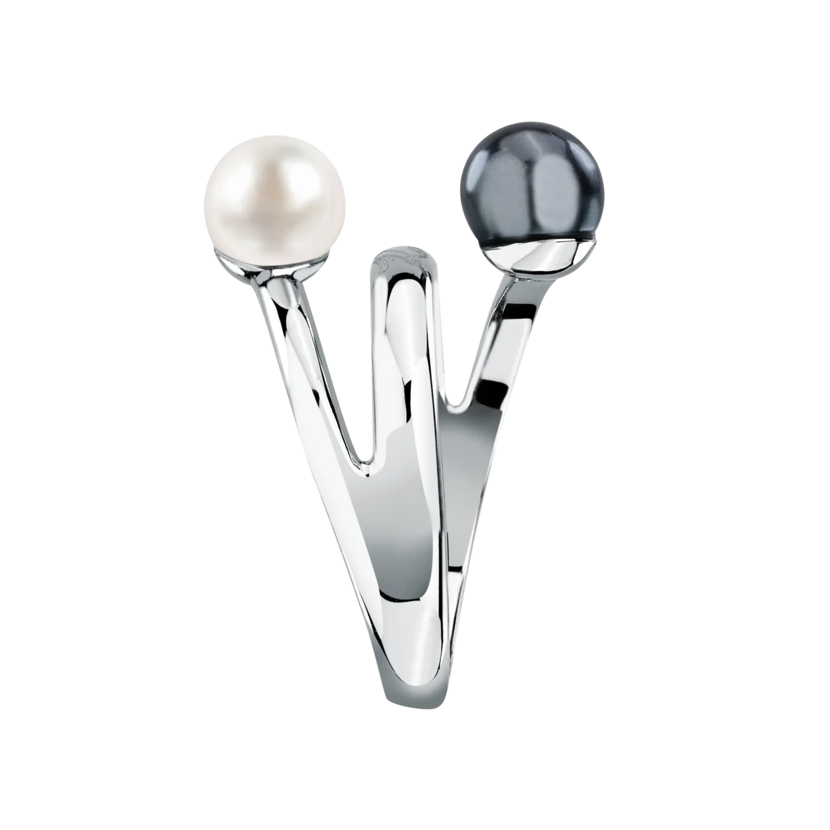 Смел и женствен, този дамски пръстен Karl Lagerfeld Pearl превръща перлите в модерен акцент. Двойната халка от полирана неръждаема стомана е завършена с две контрастни сфери – бяла и тъмносива shell перла, които създават елегантна игра на светло и тъмно.
