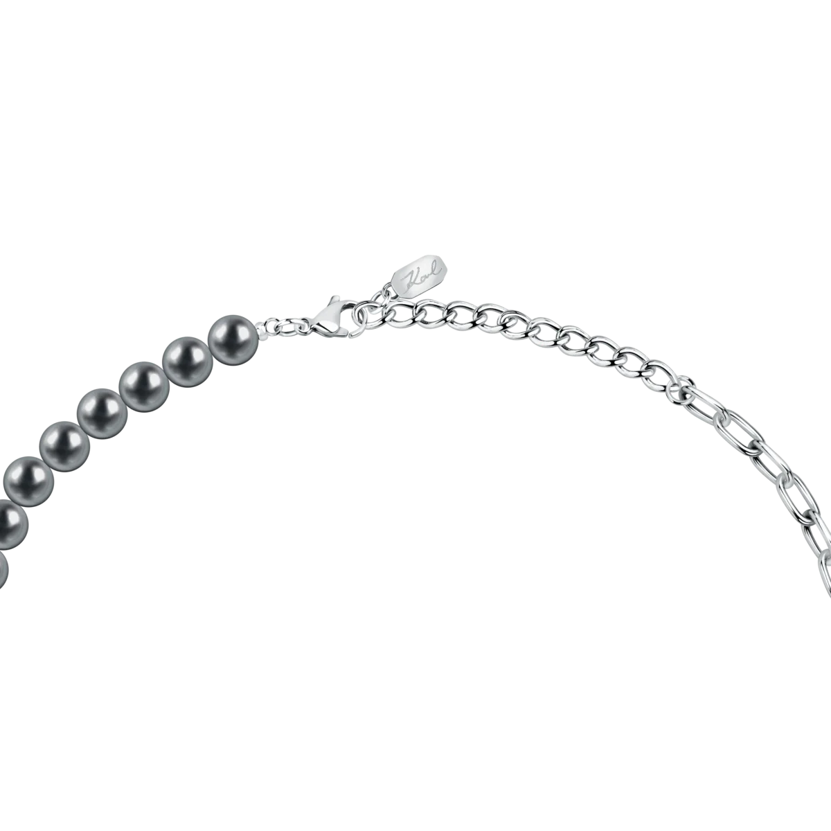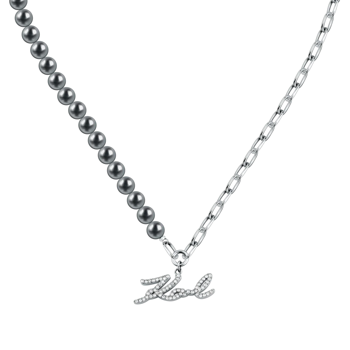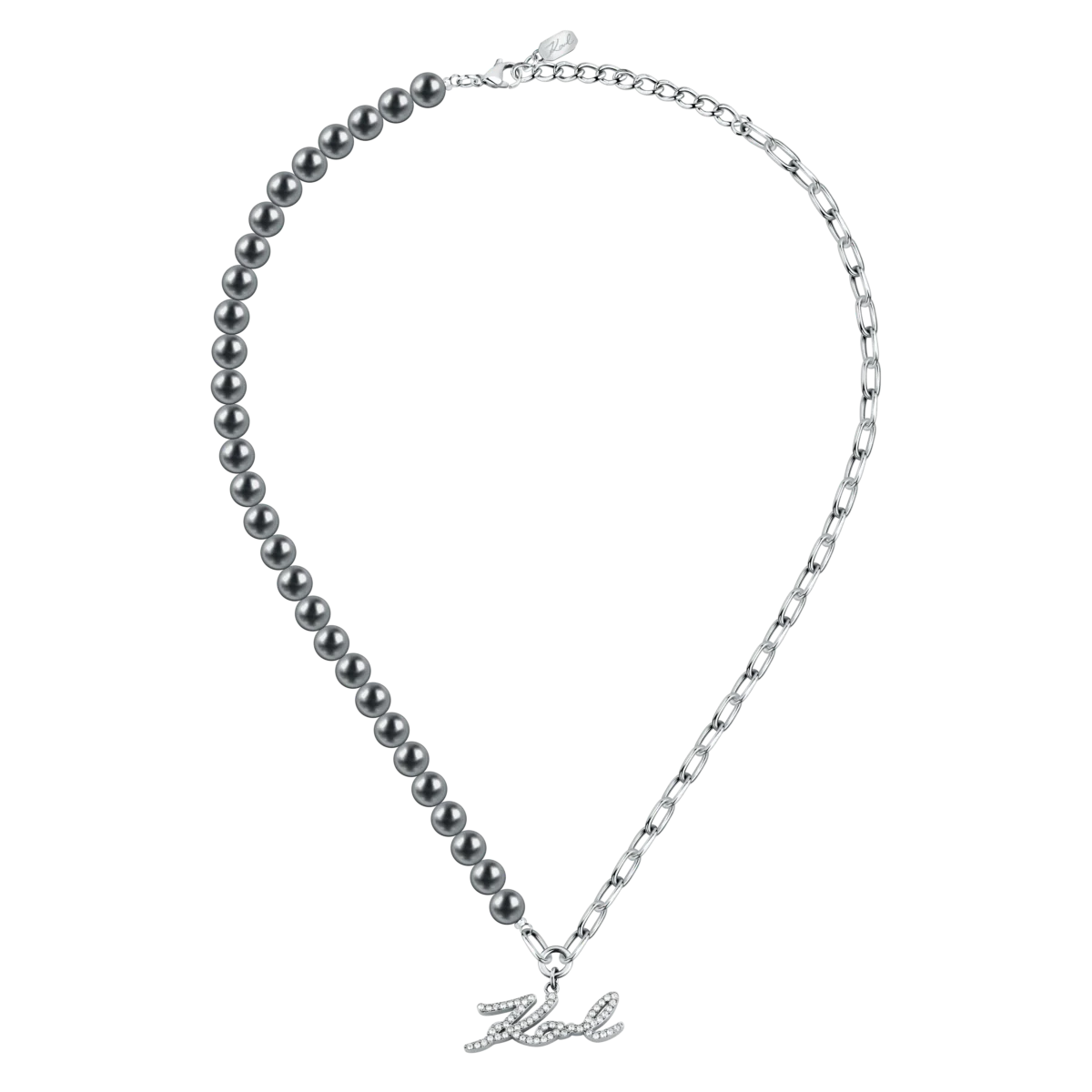 Дамското колие Karl Lagerfeld Pearl KLAYR02 е смел прочит на класическата перлена огърлица. Асиметричният дизайн комбинира ред от тъмносиви перли от едната страна и полирана сребриста верижка от другата, а в центъра блести кристалната висулка с подпис „Karl“. Резултатът е модерно бижу, което веднага привлича погледа.
