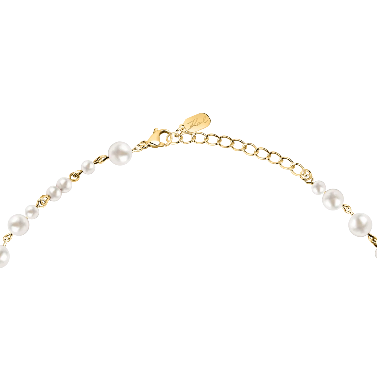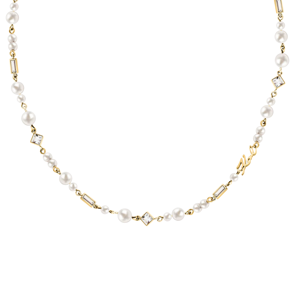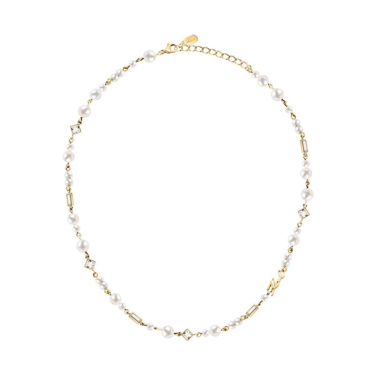 - Дизайн: фино колие с редуващи се перли, кристали и декоративен надпис „Karl“