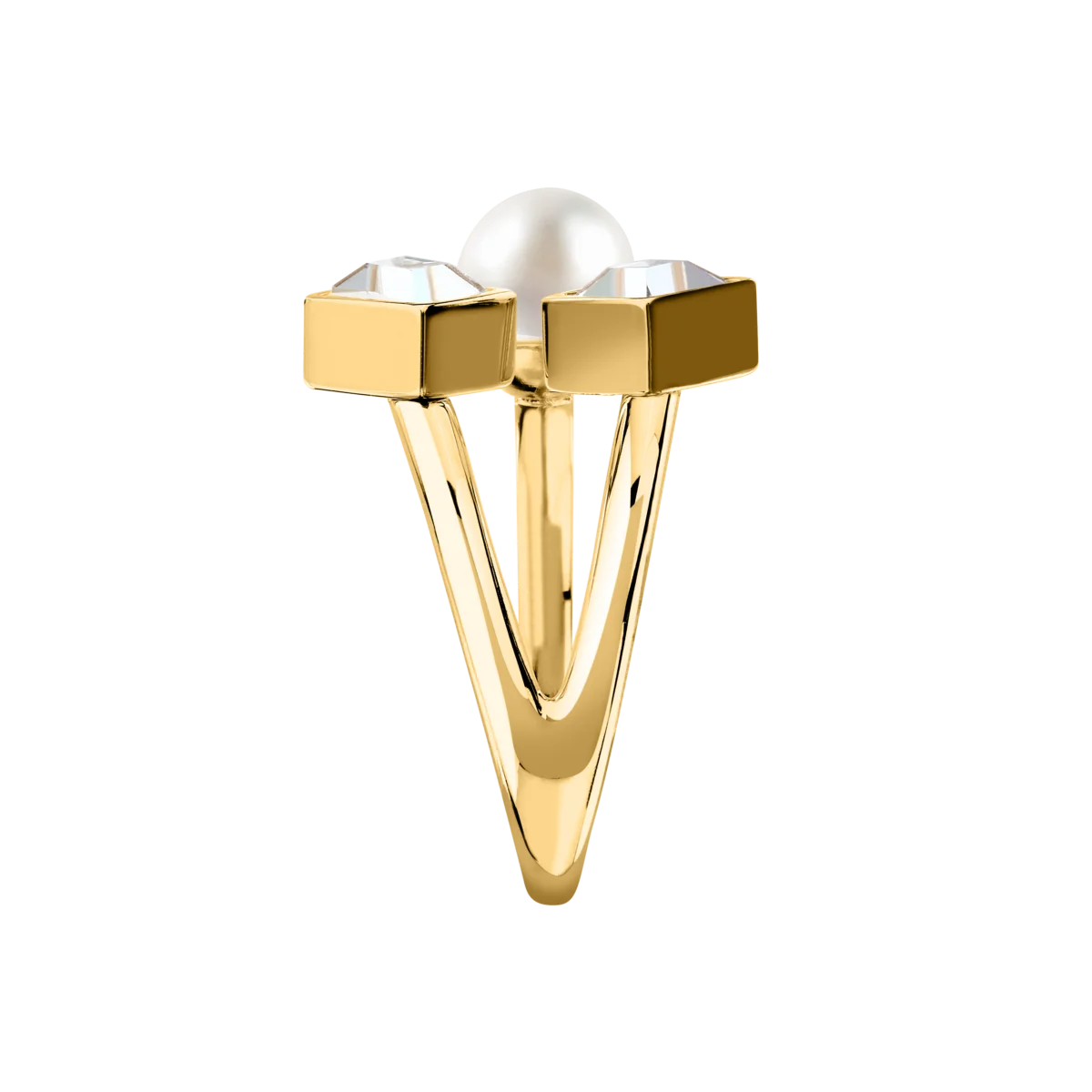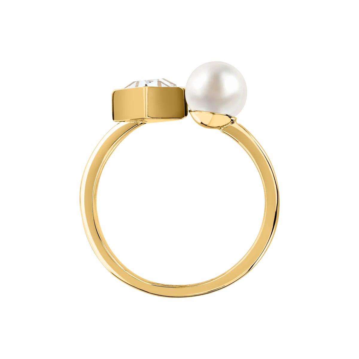 Пръстенът е изработен от висококачествена неръждаема стомана със жълто IP златно покритие, което придава наситен благороден цвят и е по-устойчиво на износване от стандартната позлата. Гладката вътрешна част осигурява комфорт, дори при целодневно носене, а полираният външен финиш отразява светлината и подчертава блясъка на кристалите и перлата.