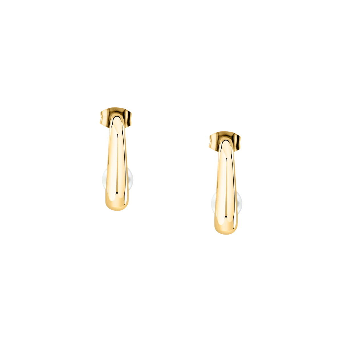 Моделът е изработен от висококачествена неръждаема стомана 316L със PVD жълтозлатисто покритие, което осигурява дълготраен цвят и луксозен блясък. Перлата е синтетична shell перла в бял цвят – с красив седефен отблясък и достатъчно устойчива за ежедневно носене. Гладката вътрешна линия на халката осигурява комфорт, а полираният външен ръб подчертава изисканата форма.