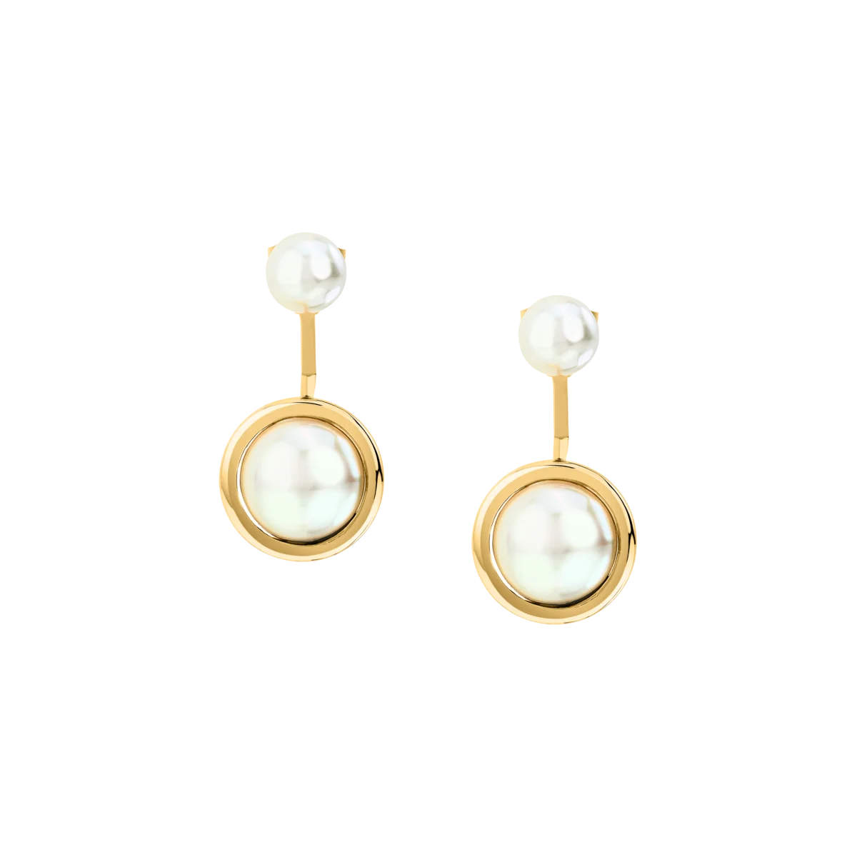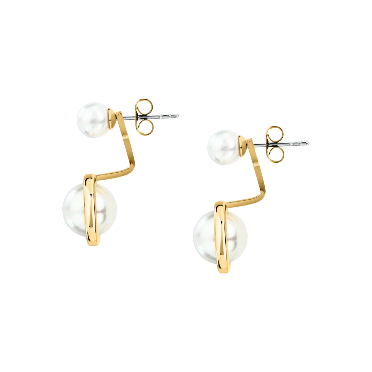 Дамските обеци Karl Lagerfeld Pearl KLAYR14 съчетават модерна геометрия и класическа елегантност на перлите. Дизайнът тип ear jacket с малка перла до ухото и по-голяма перла в златист кръг под лобчето създава изискано движение и нежно рамкира лицето.