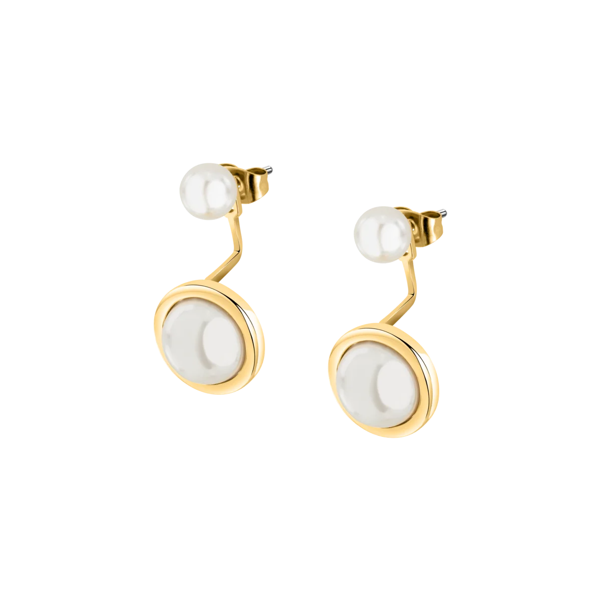 Изработени са от висококачествена неръждаема стомана със жълто IP златно покритие, което придава наситен цвят и отлична устойчивост на износване. Бялите shell перли (синтетични перли с перлен блясък) са гладко полирани и подредени така, че да изглеждат сякаш плават в златистата обковка. Дължината около 2,2 см ги прави достатъчно забележими, но комфортни за целодневно носене.