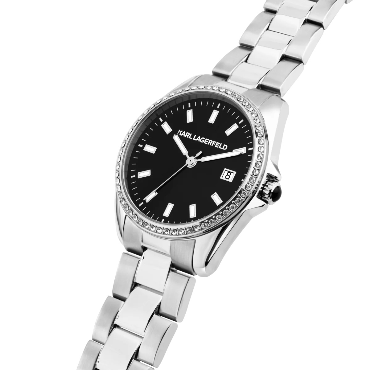 Корпусът и гривната са изработени от неръждаема стомана 316L с полирана повърхност, която запазва своя блясък дълго време. Безелът е дискретно декориран с ред от фини кристали, които подчертават черния циферблат тип sunray. Правите индекси и трите стрелки в метален цвят осигуряват отлична четимост, а в прозореца при 3 часа удобно се разчита датата. Циферблатът е защитен от минерално стъкло, устойчиво на надраскване в динамичното ежедневие.
