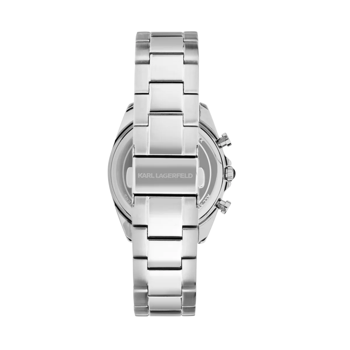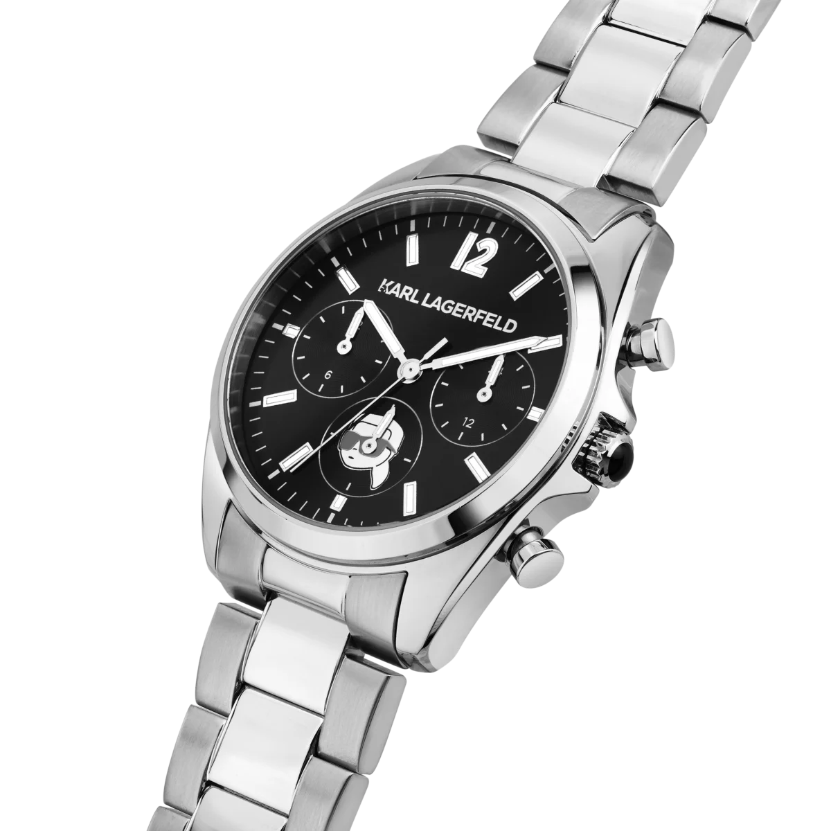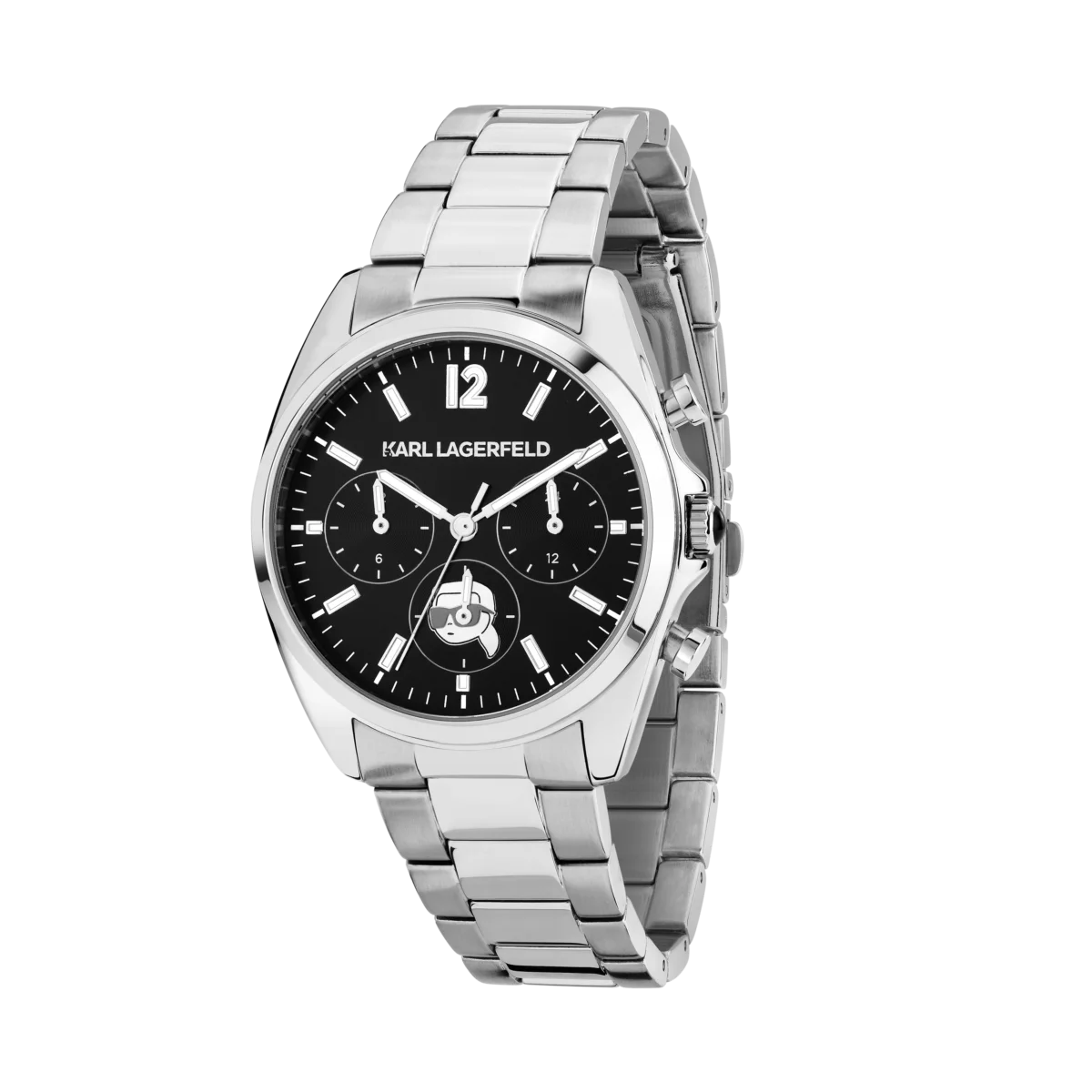 Дамският часовник Karl Lagerfeld Round Essentials съчетава спортен силует и градска елегантност. Кръглият корпус с диаметър 38 мм и черният мултифункционален циферблат с три скали придават модерен, леко унисекс характер – идеален за жени, които обичат по-смели аксесоари.