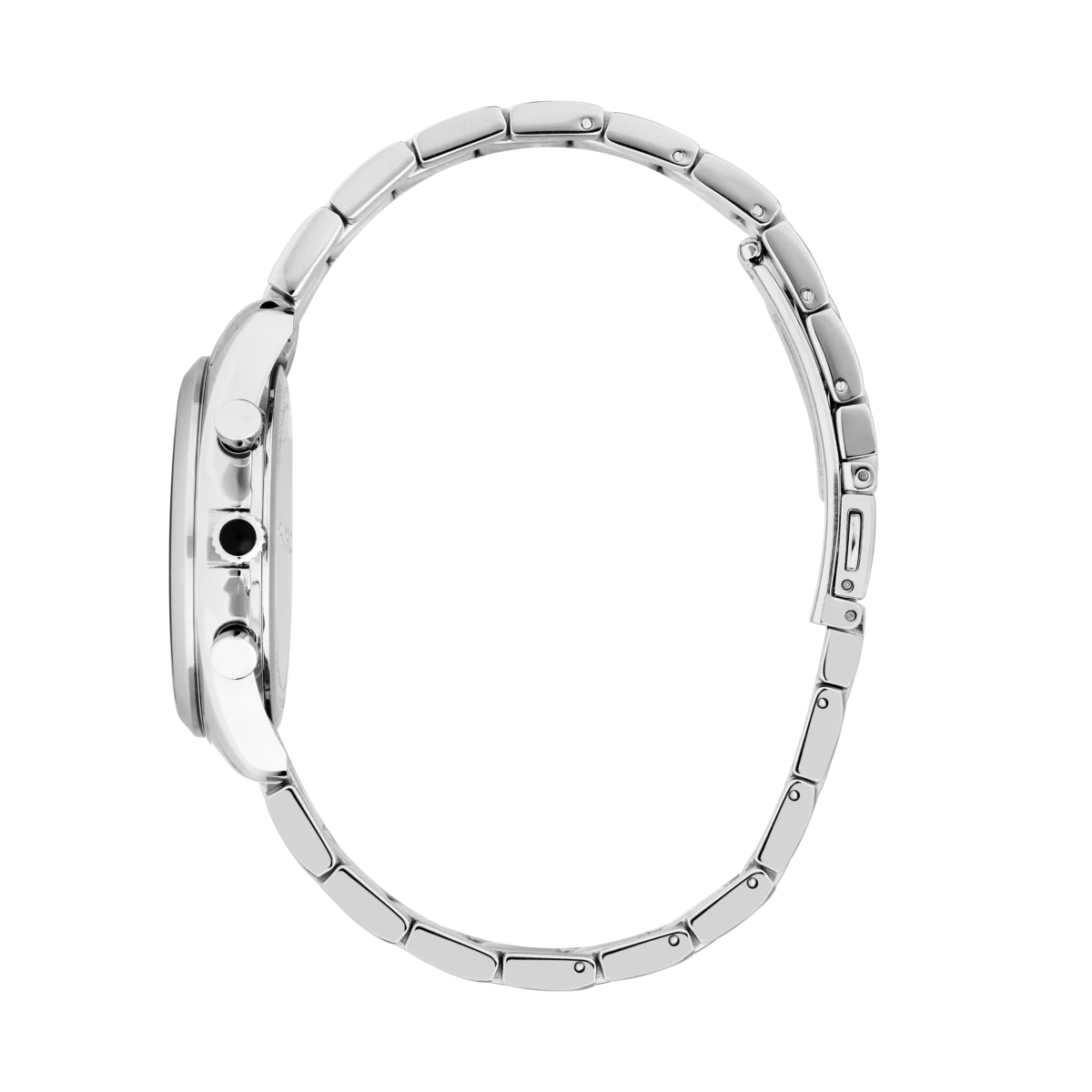 Корпусът и гривната са изработени от неръждаема стомана с PVD сребристо покритие, което осигурява дълготраен блясък и по-висока устойчивост на износване. Полираният метал плавно преминава в масивна стоманена верижка тип bracelet, завършена с разгъваща се закопчалка с бутони за сигурно и удобно прилягане. Минералното стъкло защитава черния циферблат тип sunray, върху който индекси и контрастни стрелки осигуряват отлична четимост.