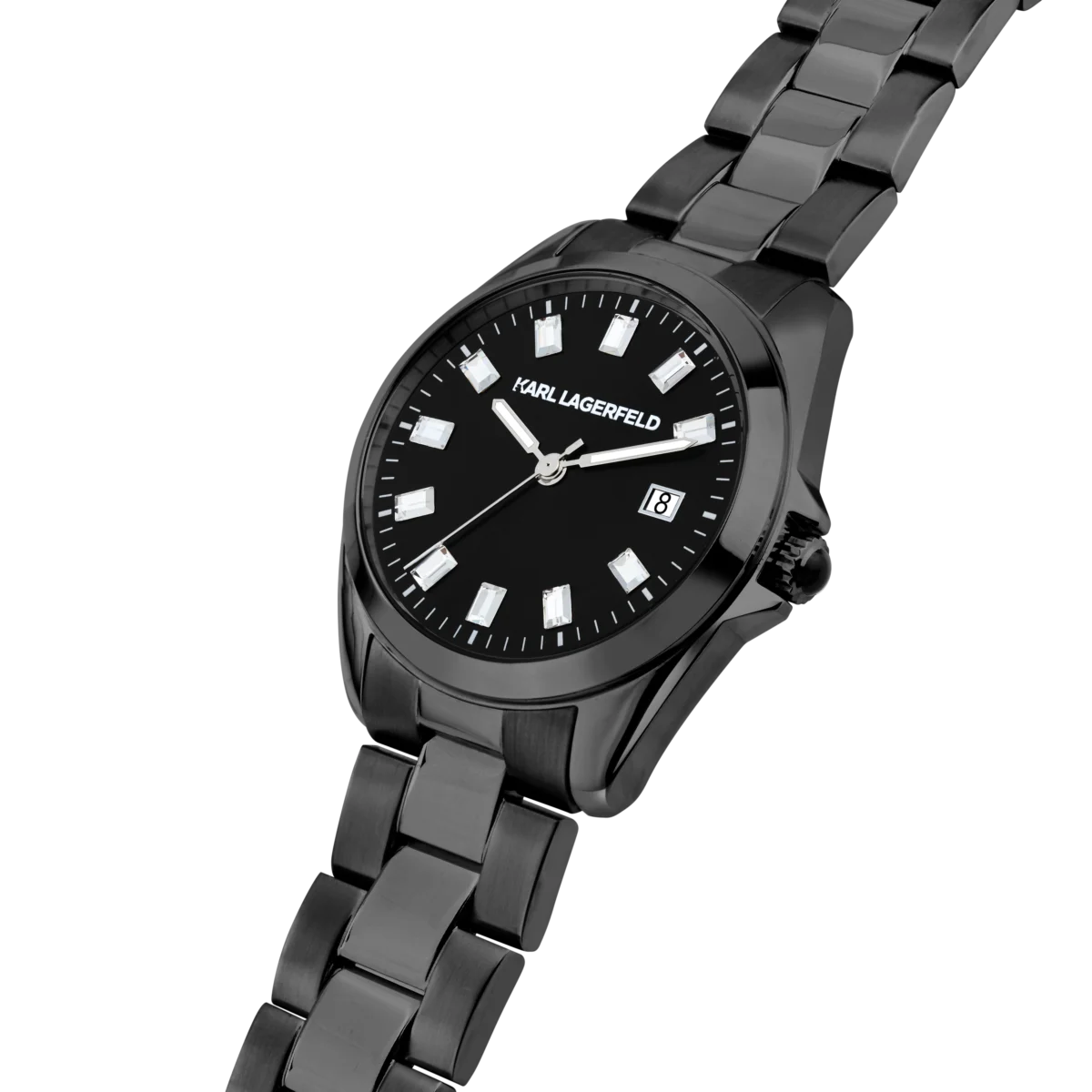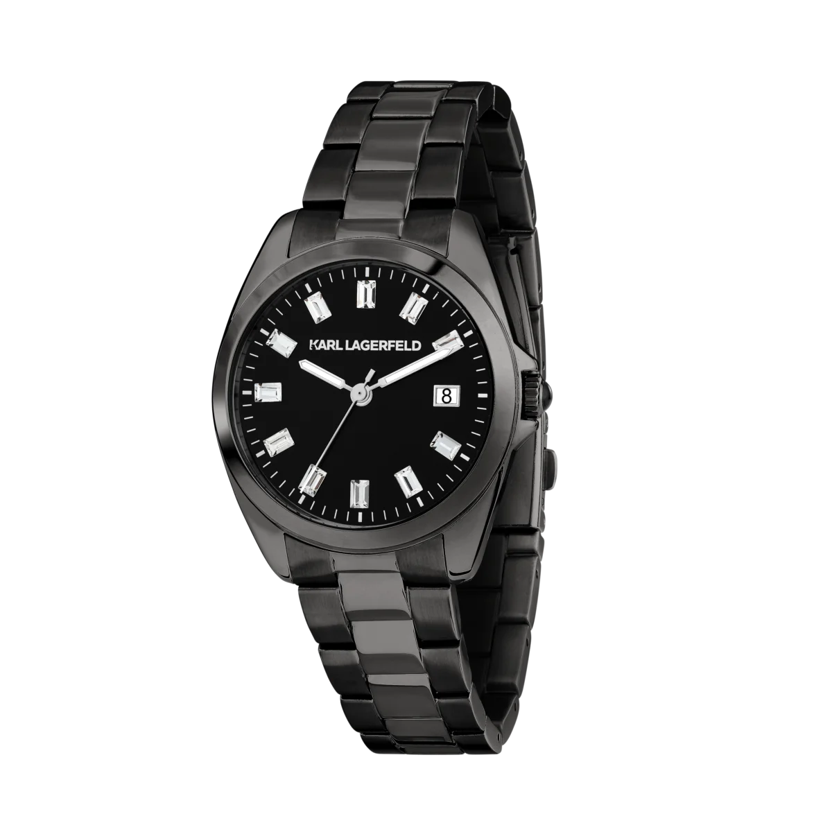 Дамски часовник Karl Lagerfeld Round Essentials R0553101513 впечатлява с дръзка all black визия и чисти линии. Кръглият корпус с диаметър 35 мм прелива плавно към масивна верижка, а черният циферблат е подчертан от продълговати кристални индекси и прозорец за дата при 3 часа. Ясният контраст между светлите индекси и тъмния фон прави отчитането на часа бързо и удобно.