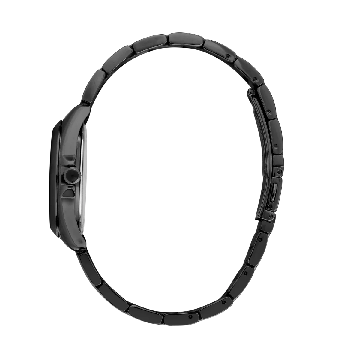 Корпусът и верижката са изработени от неръждаема стомана 316L с черно PVD покритие – издръжлива технология за йонно нанасяне на цвета, която запазва наситения нюанс и блясък години наред. Минералното стъкло защитава циферблата от ежедневни надрасквания, а стоманената верижка в тъмносив (gunmetal) тон с разгъваща се закопчалка с бутони стои стабилно и комфортно на китката.