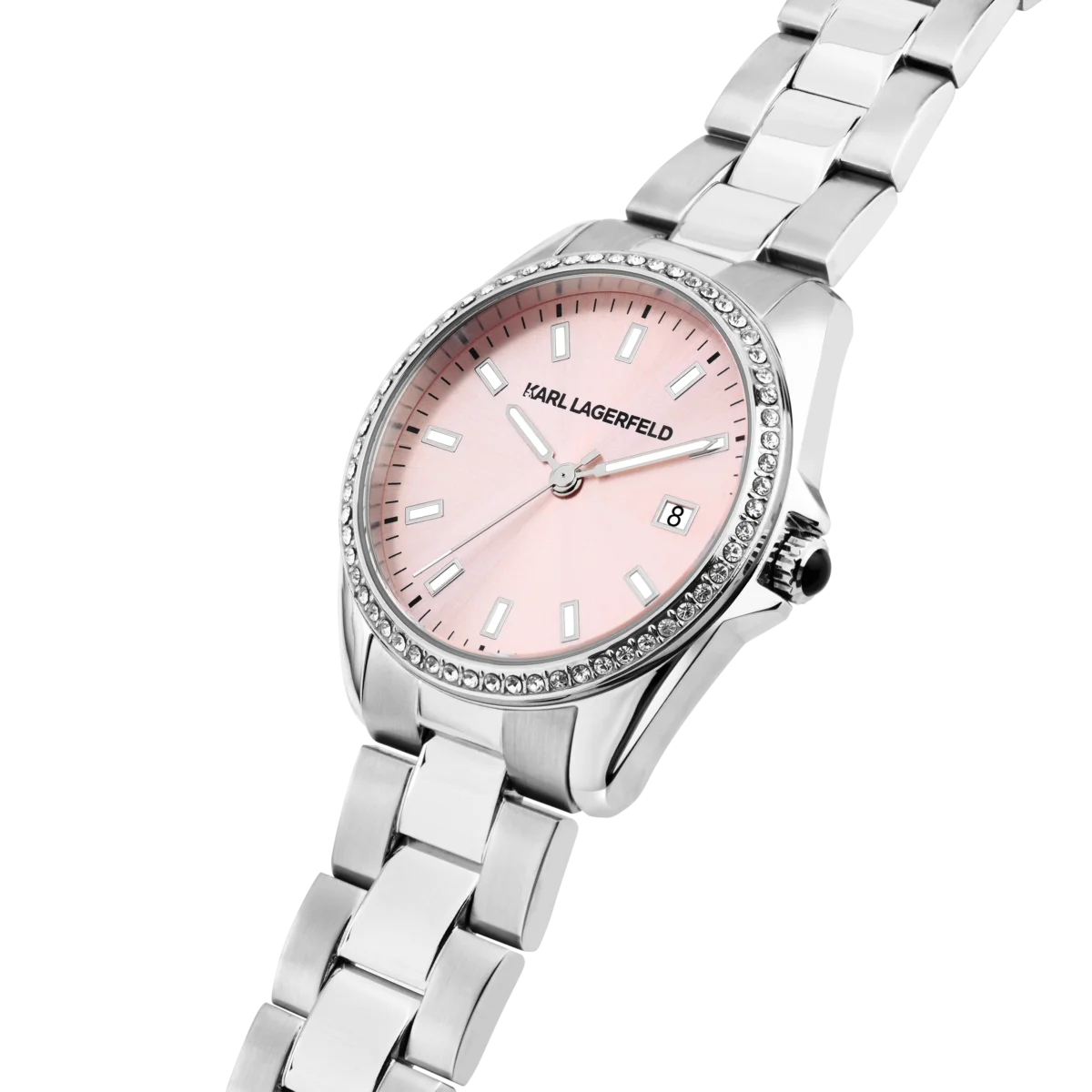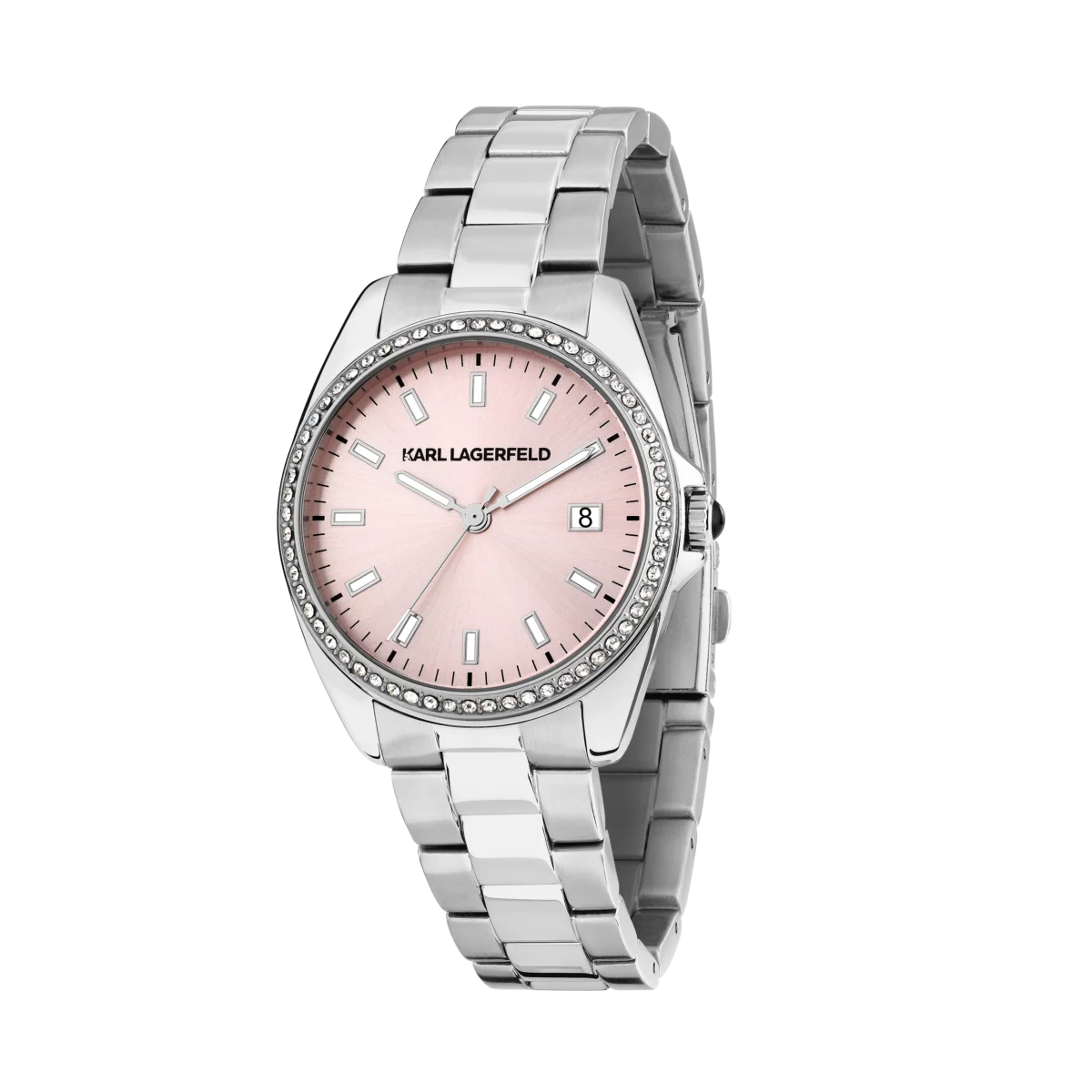 Нежният дамски часовник Karl Lagerfeld Round Essentials комбинира модния блясък на марката с ежедневно удобство. Мекият розов sunray циферблат с кристални индекси и прозорец за дата при 3 часа създава женствен акцент, който лесно се съчетава както с костюм, така и с любима риза и дънки.