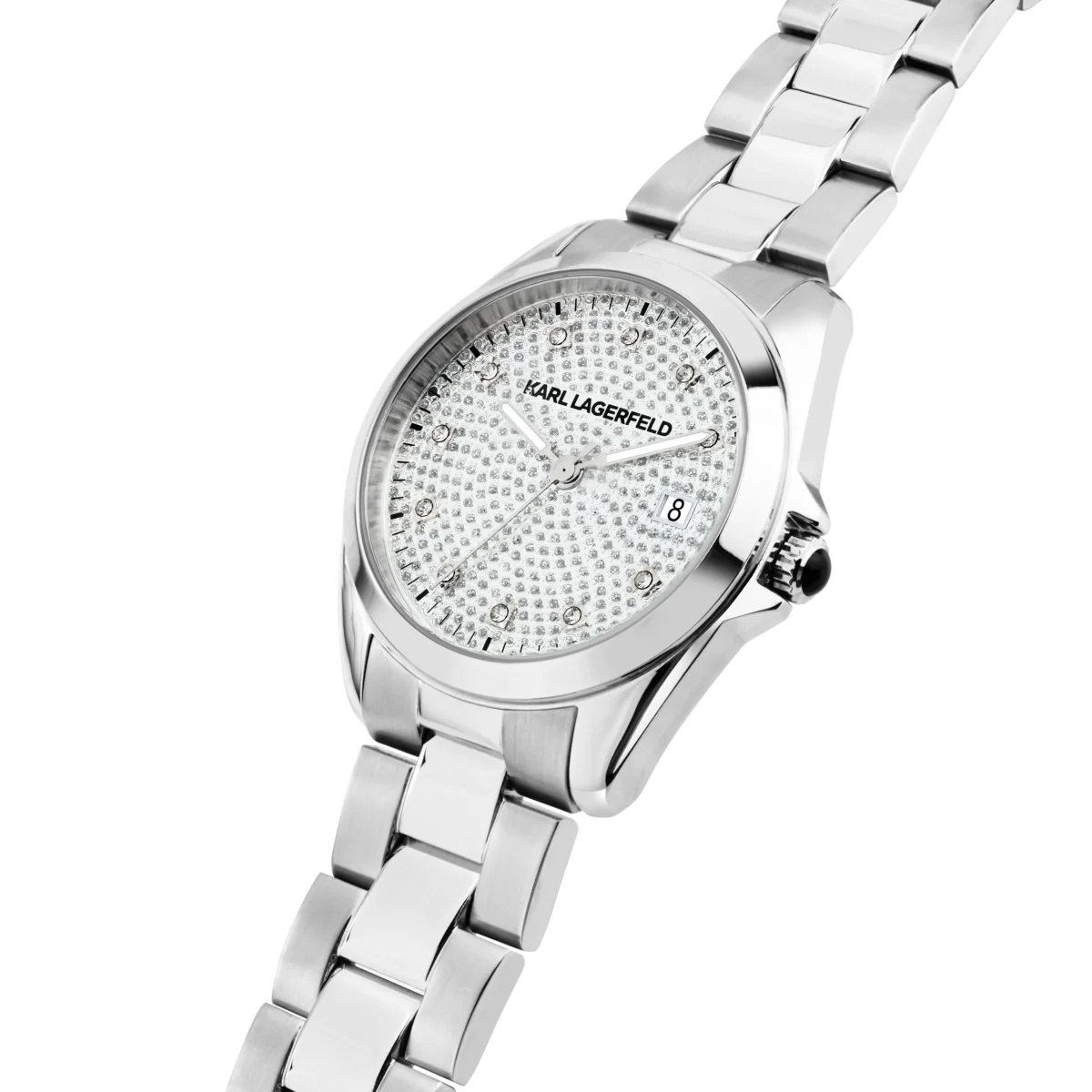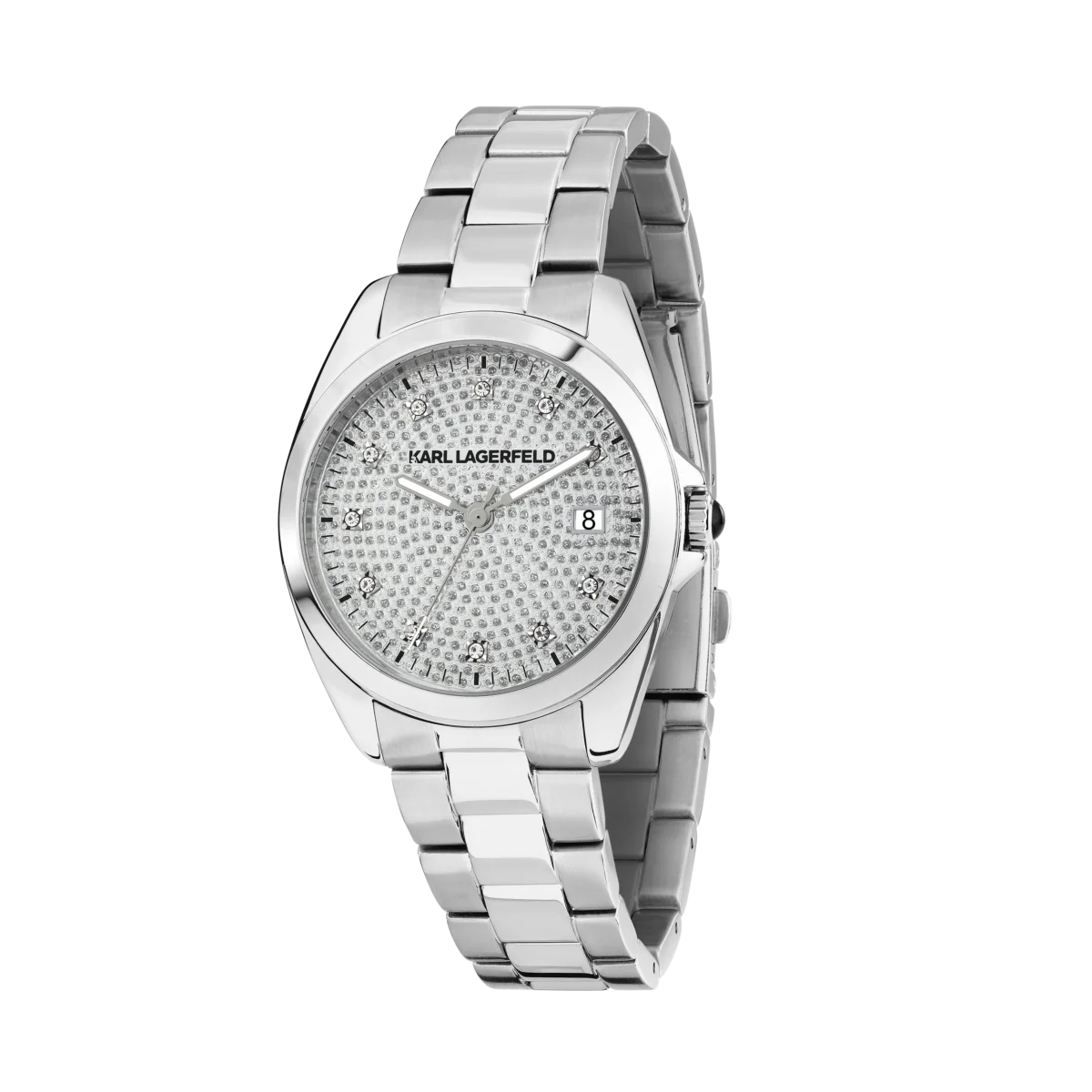 Този дамски часовник Karl Lagerfeld Round Essentials е създаден за жени, които обичат градския блясък. Кръглият сребрист циферблат с ефект diamond dust и кристални индекси улавя светлината като паве от миниатюрни камъни, а изчистеният силует остава елегантен и лесен за комбиниране с всяка визия.