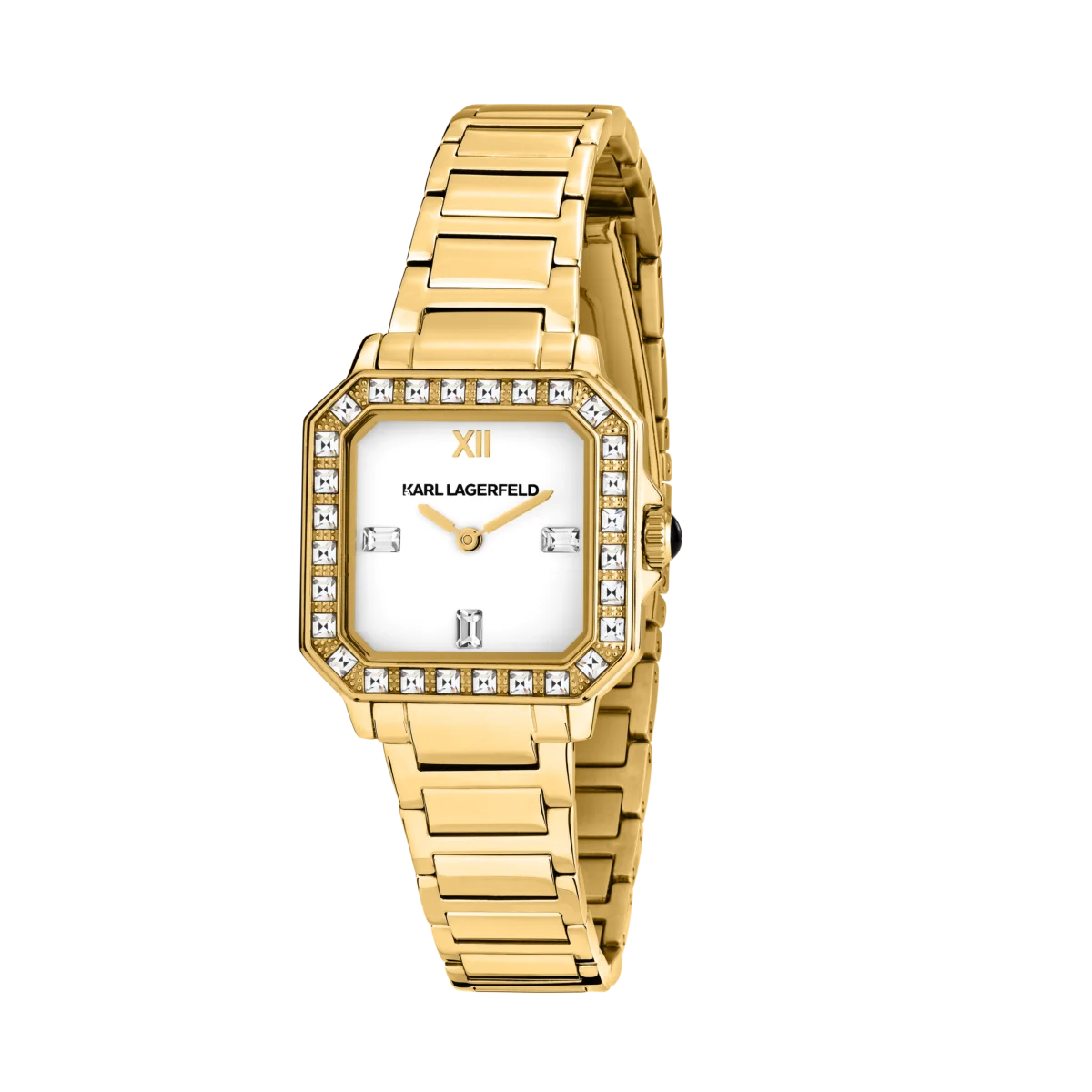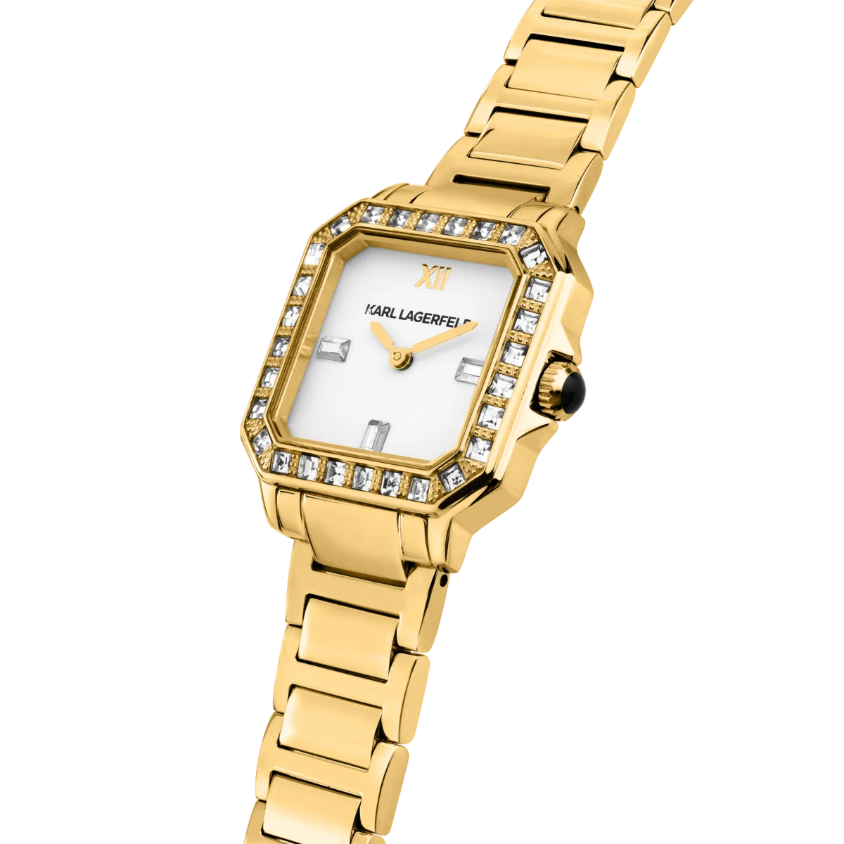 Лъчезарен и женствен, този дамски часовник Karl Lagerfeld Square Classics превръща всяко движение на китката в малък светлинен спектакъл. Класическият квадратен корпус с фасетирани ръбове и рамка от кристали напомня луксозно бижу, а чистият бял циферблат придава модерна елегантност.