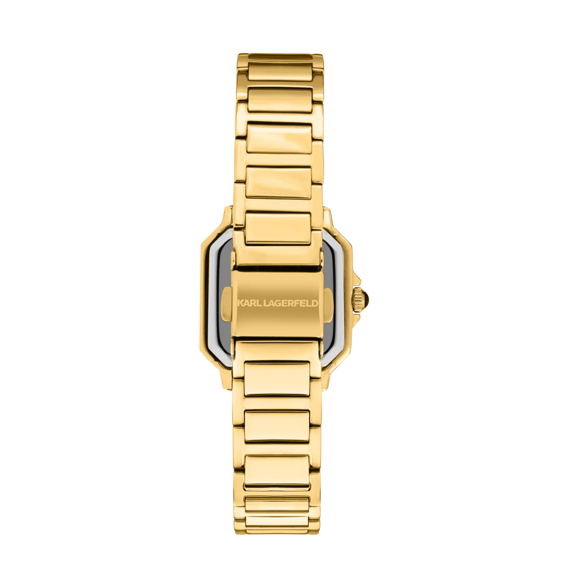 Корпусът и верижката са изработени от неръждаема стомана 316L с IP златно покритие – устойчиво на износване и избледняване, подходящо за ежедневна употреба. Минералното стъкло защитава от дребни надрасквания, а кристалните маркери и римската цифра XII подчертават характерния стил на Karl Lagerfeld.