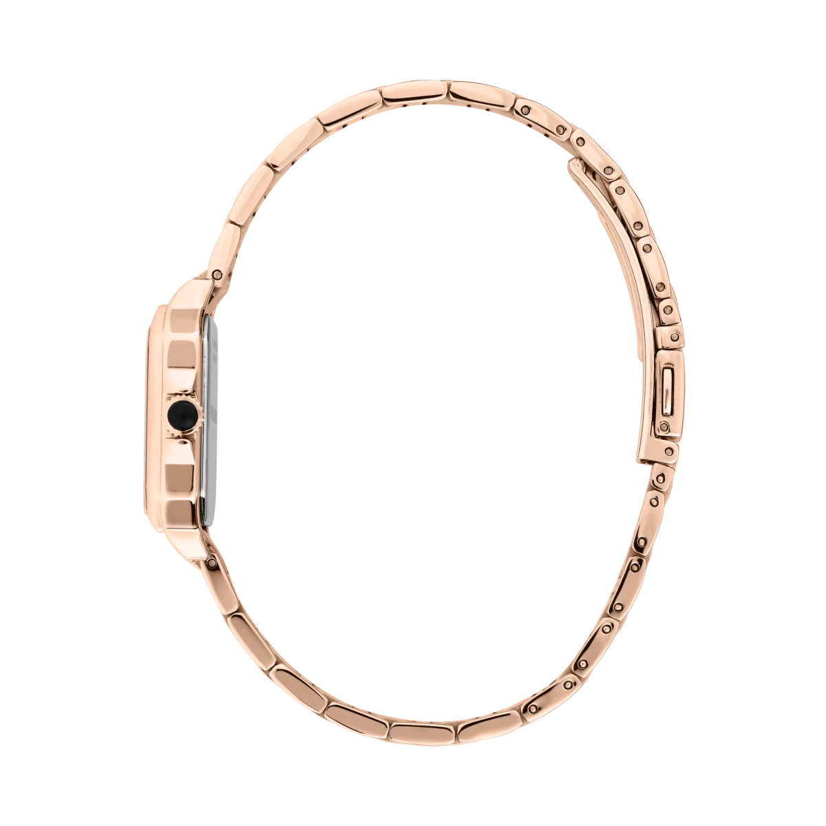 Праволинейната стоманена гривна с разгъваща се закопчалка с бутони осигурява сигурно и удобно прилягане, така че часовникът да се носи без усилие през целия ден. Този розово-златист дамски часовник от неръждаема стомана е идеален избор за офис визии, вечерни излизания и като стилен подарък.