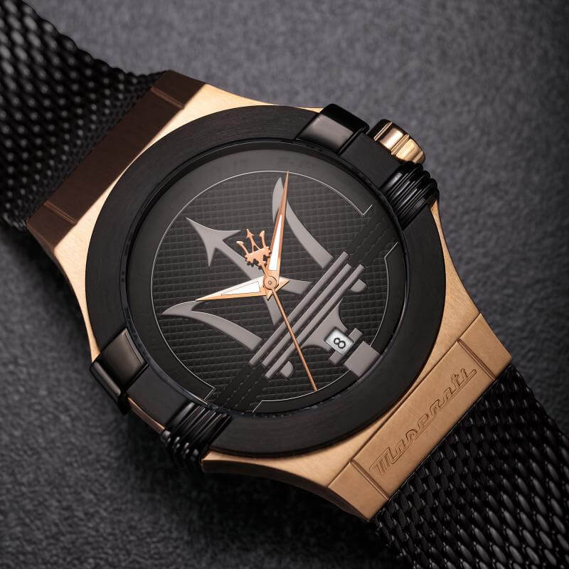 Часовник Maserati Potenza. Мъжки часовник с кварцов механизъм TMI VJ42. Каса 42 мм от стомана с розово златно PVD покритие. Черен циферблат и верижка от стомана с черно PDV покритие. Водоустойчивост 10 ATM. Минерално стъкло. Гаранция 2 години.
