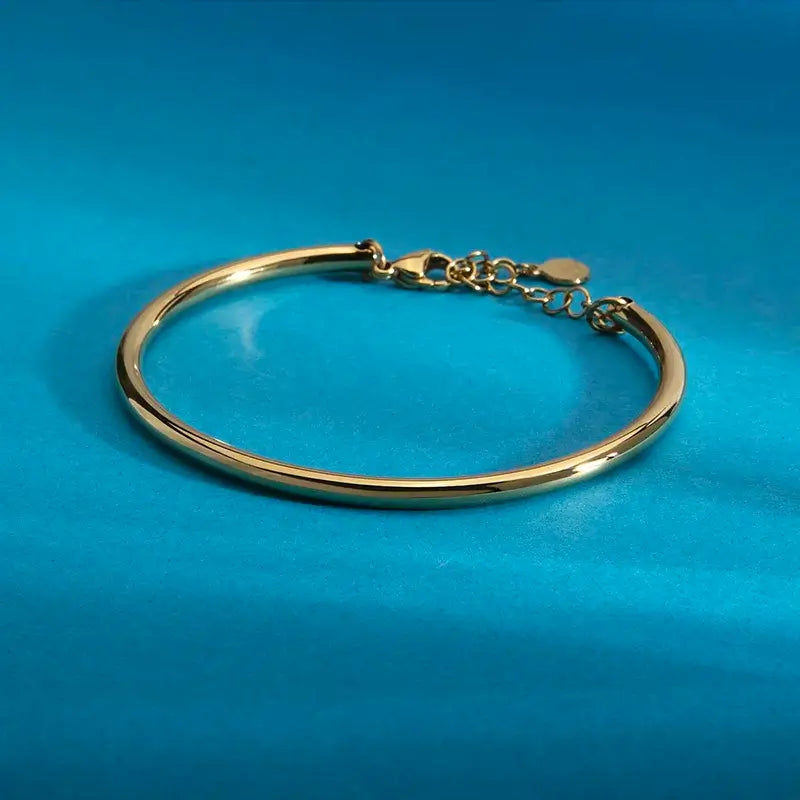 Страничен профил на тънка позлатена твърда гривна, огледален блясък.