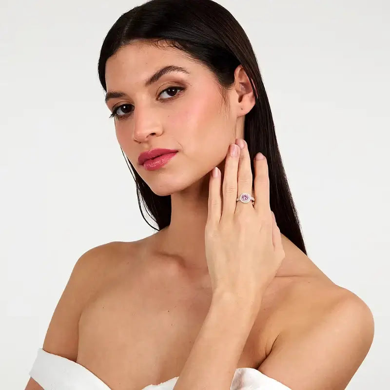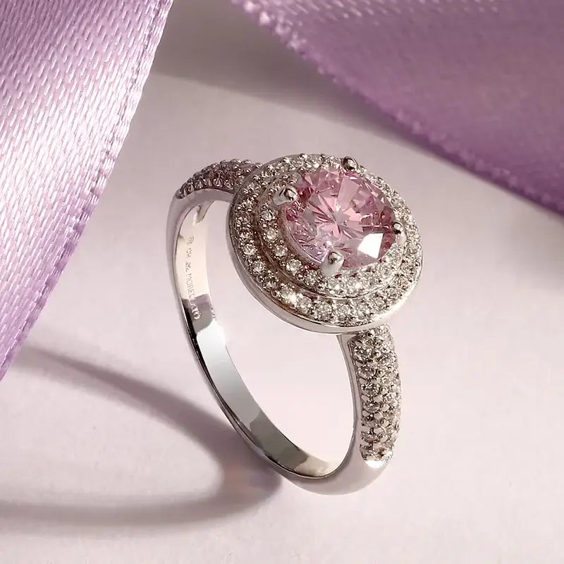 Сребърен пръстен 925 с родиево покритие, розов централен циркон и бели ореоли – студиен кадър отпред.