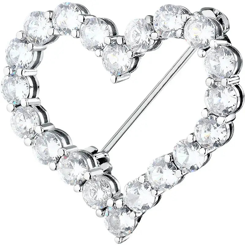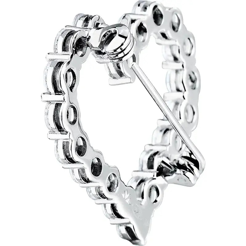 Сребърна брошка във форма на сърце с бели циркони, студиен кадър.
