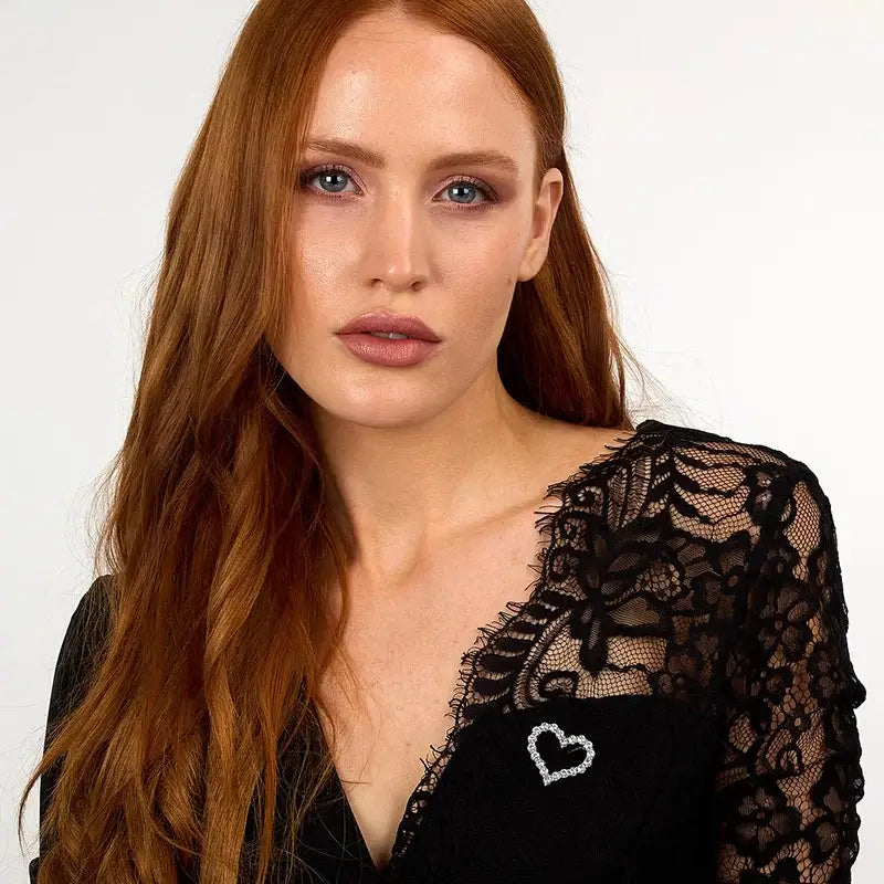 Сребърна брошка с бели циркони върху сако, портрет на модел.
