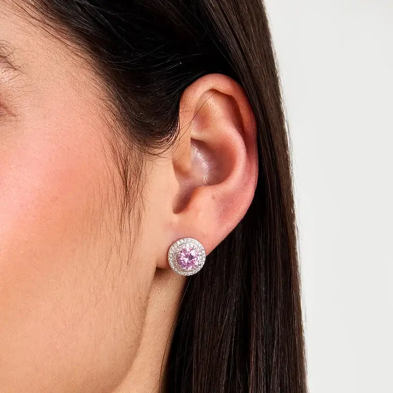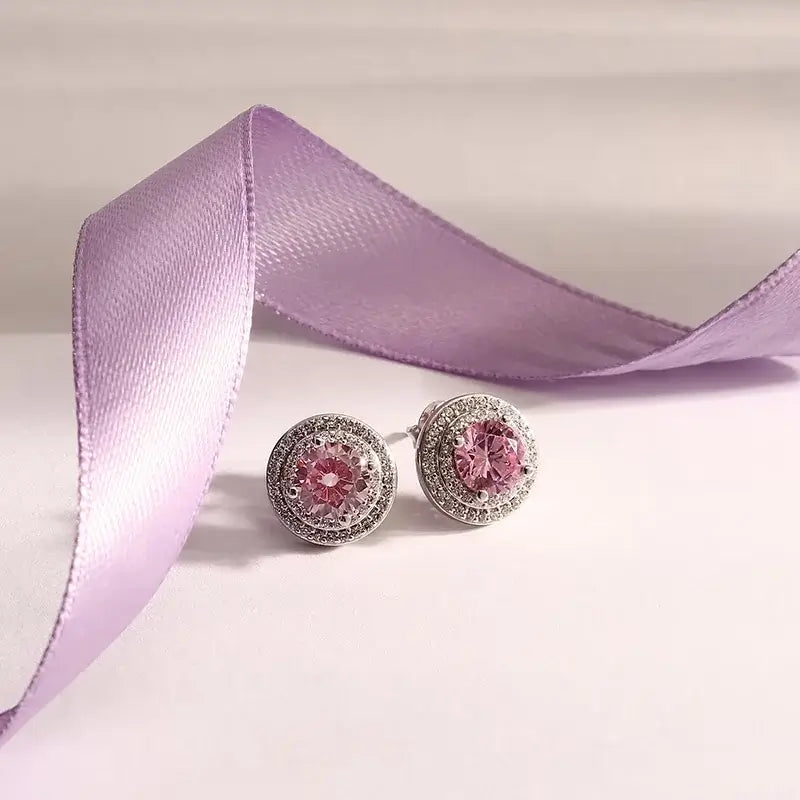 Сребърни обеци 925 „ореол“ с розов централен циркон и бели циркони, студиен кадър отпред.