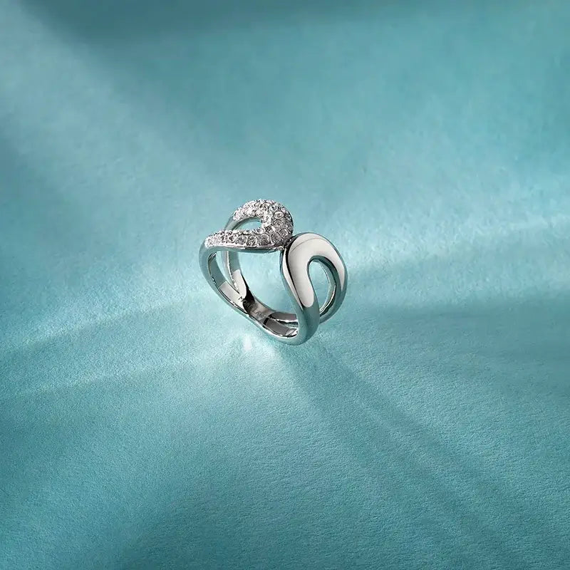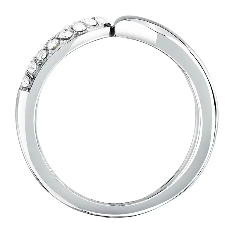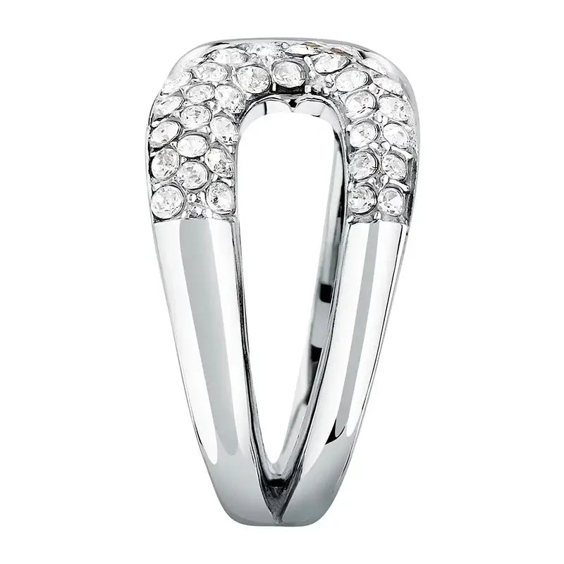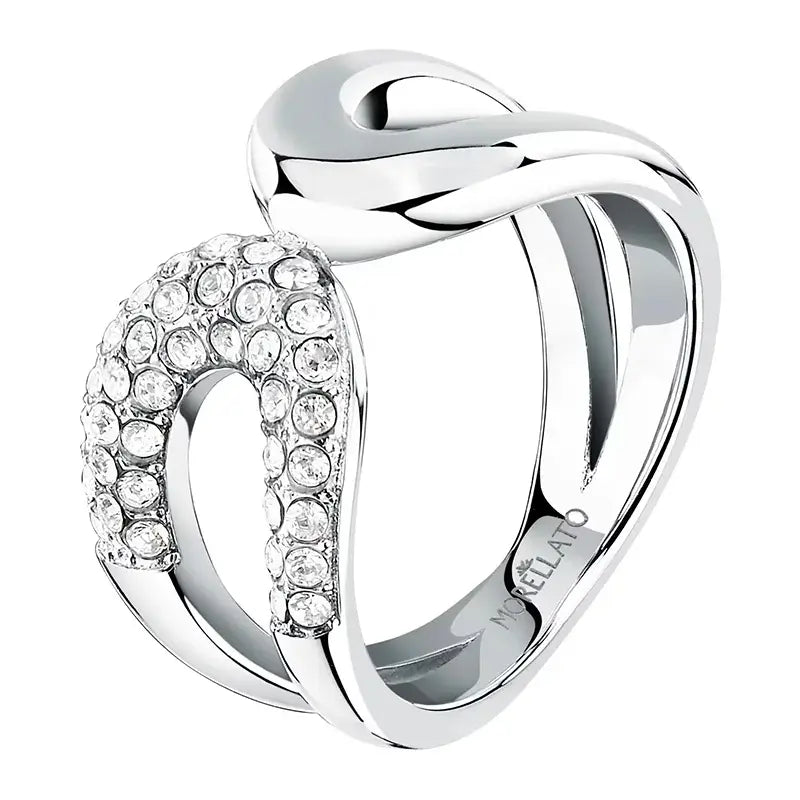 Скулптурен пръстен Morellato Design с модерна двупосочна линия и блестящ pavé от бели кристали. Изработен е от неръждаема стомана с огледален сребрист финиш – устойчива и хипоалергенна за всекидневно носене. Шината е елегантно отворена отгоре, а плавните обеми стоят изразително и комфортно. Перфектен за соло акцент или комбиниране с минимални халки и сребристи гривни. Предлага се в размери 12, 14, 16 и 18.