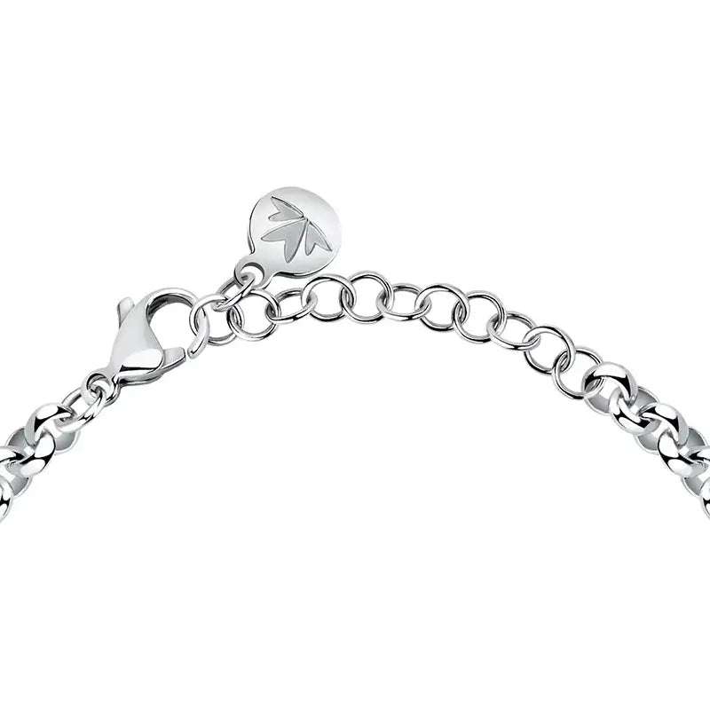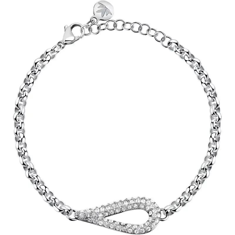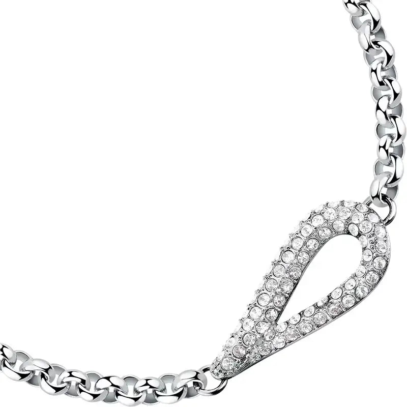 Фина гривна Morellato Design с елегантна верига и централна висулка „капка“, инкрустирана с бели кристали за равномерен блясък. Изработена е от неръждаема стомана – хипоалергенна и устойчива на ежедневно носене. Дължината е 16 см с +3 см удължител и карабинка за точно напасване. Кристалите са с диаметър Ø1,5 мм и Ø1,3 мм и са поставени прецизно по контура на висулката. Универсален сребрист акцент, който се комбинира лесно с часовник и други гривни.