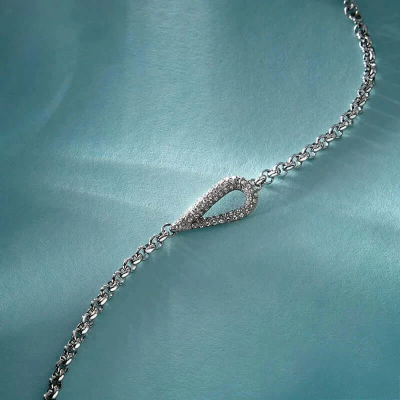 Сребриста гривна от неръждаема стомана с висулка „капка“, инкрустирана с бели кристали – студиен кадър.